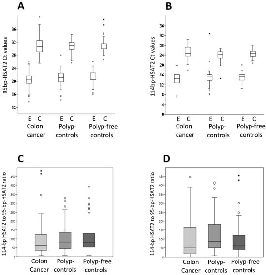 Figure 3A,B show the distribution of Ct values for the 95 bp-HSAT2 and 114 bp-HSAT2 within the study groups as determined by the DNA extraction and hybridization capture assay. As expected, the 95 bp-HSAT2 is less abundant (e.g., higher Ct values) than the 114 bp-HSAT2, as it represents a specific sequence, whereas the primers for 114 bp-HSAT2 cover several alternative sequences (see Figure 1) and some longer ones. The variance in Ct values was higher in the DNA extraction than in the capture assay. It was highest in patients with colon cancer compared to control groups, suggesting a greater oscillation of cfDNA concentrations in cancer patients.