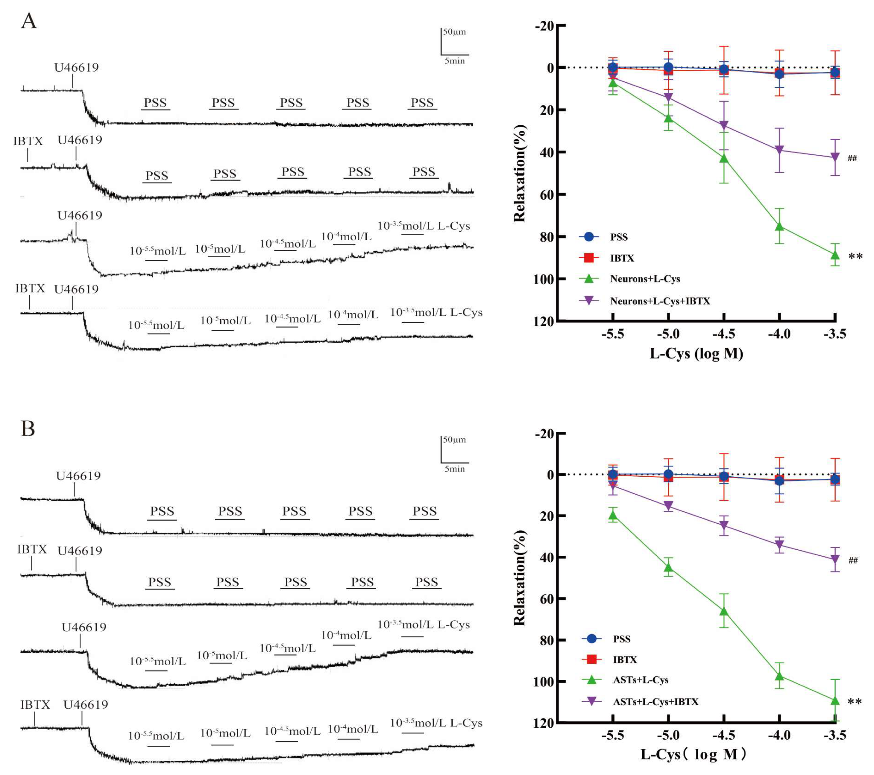 3.6. Effect of IBTX on the Relaxation of Rat MCA Induced by the Co-Application of L-Cys and Rat Nerve Cells
