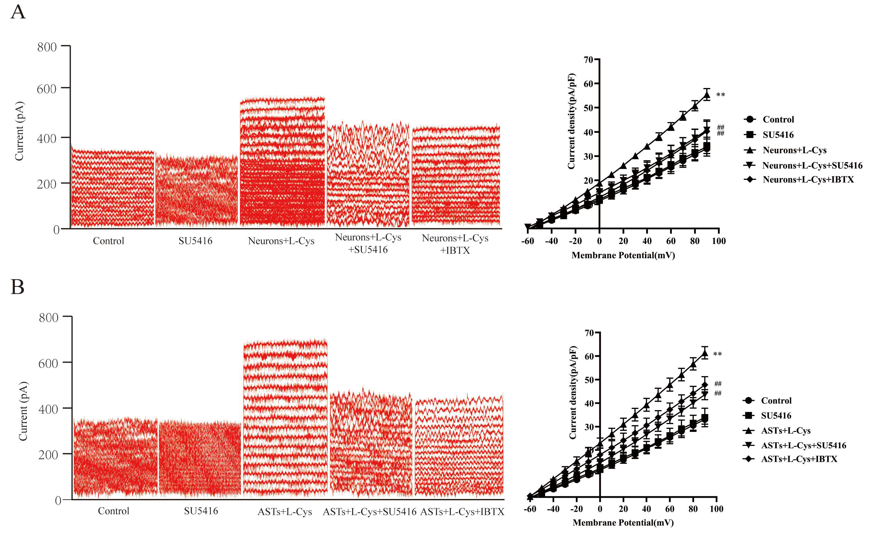 3.10. Involvement of VEGFR2 in the Current of BKCa Channels Increased by L-Cys with Rat Neurons or ASTs