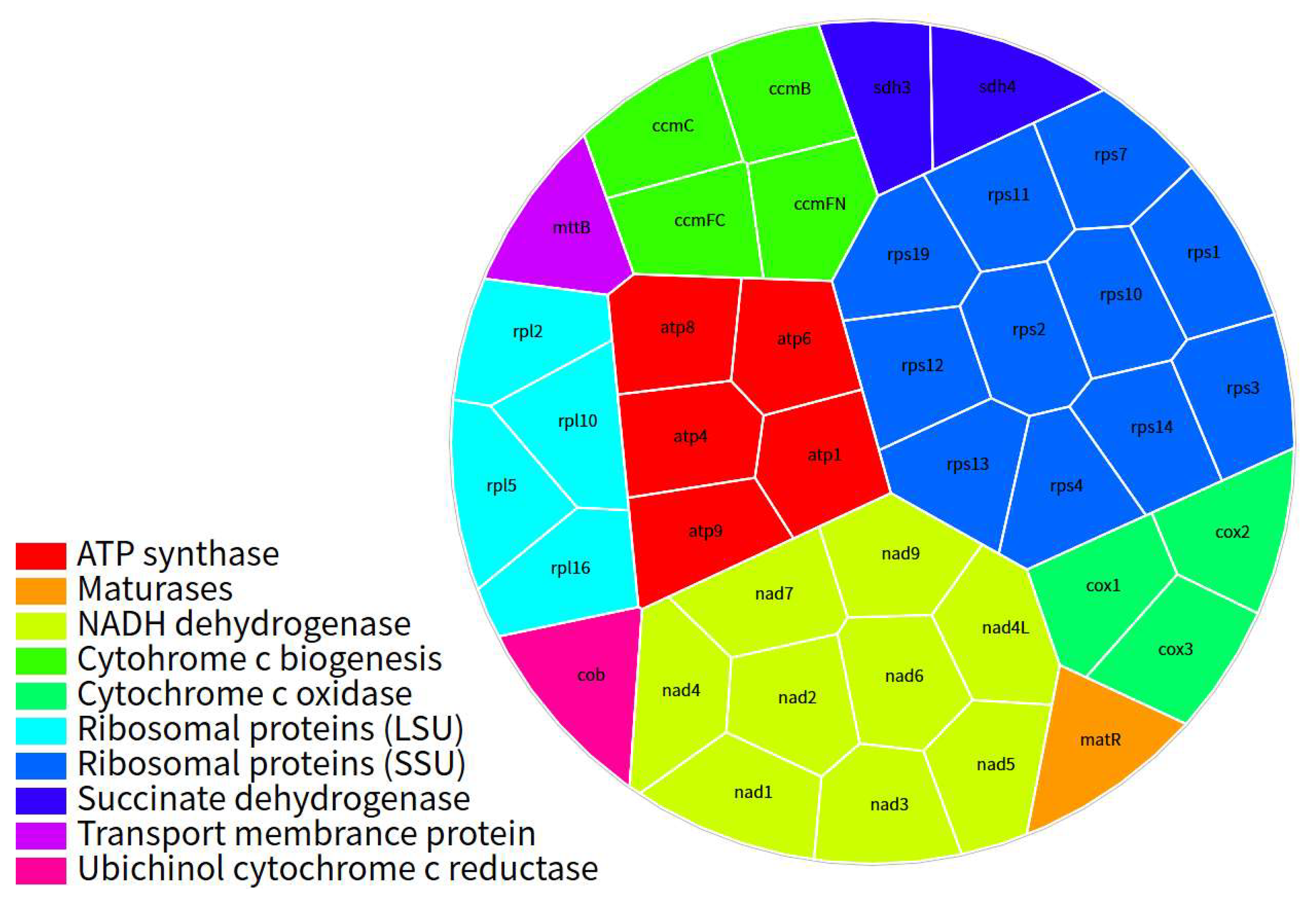 - Palmer, J.D.; Adams, K.L.; Cho, Y.R.; Parkinson, C.L.; Qiu, Y.L.; Song, K.M. Dynamic evolution of plant mitochondrial genomes: Mobile genes and introns and highly variable mutation rates. Proc. Natl. Acad. Sci. USA 2000, 97, 6960–6966. [Google Scholar] [CrossRef] [PubMed]