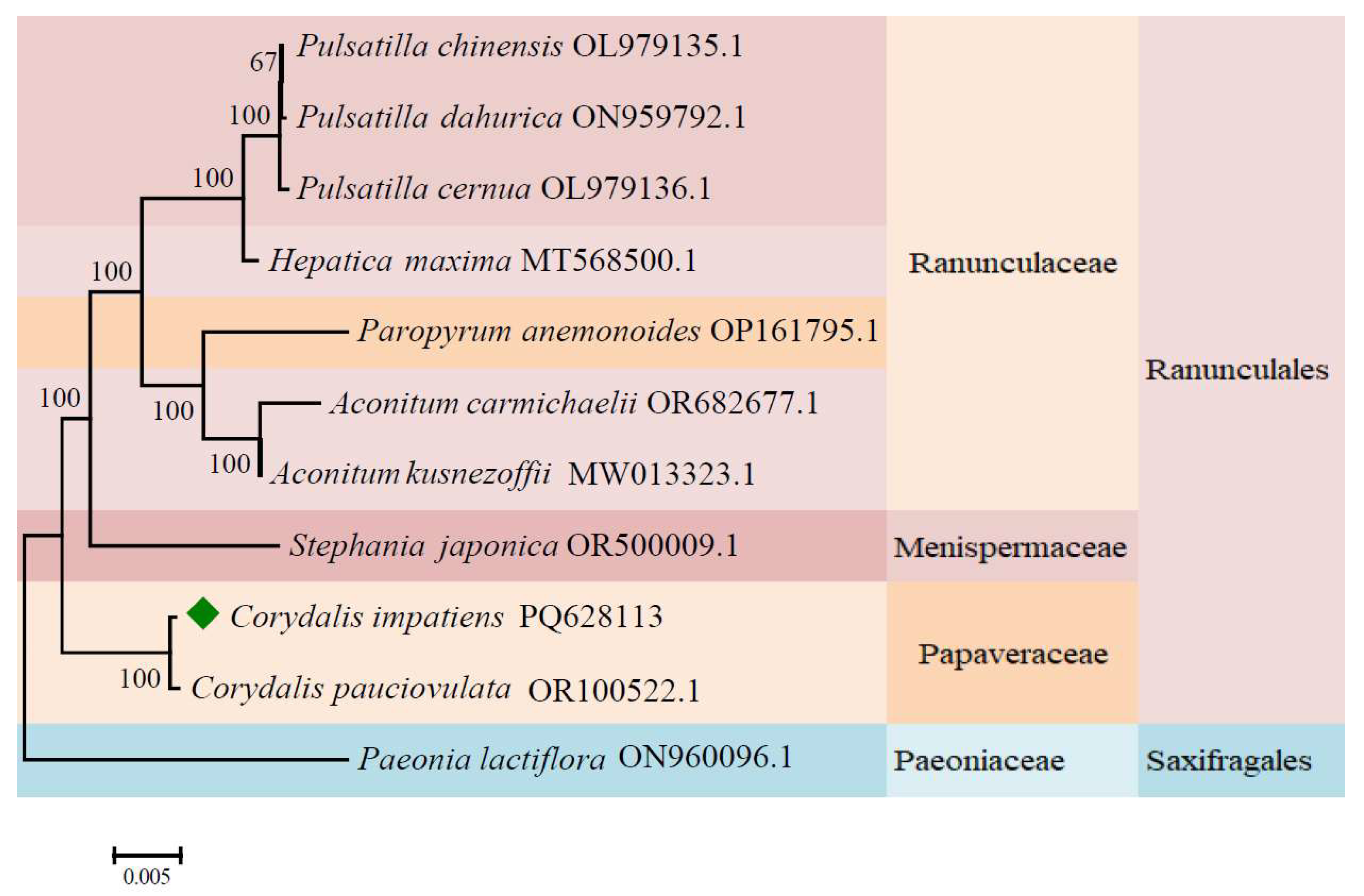 - Wan, D.; Bao, H.; Danzeng, Q.; Guo, X.; Li, Q. Chloroplast genome of Corydalis impatiens (Pall.) Fisch. ex DC. (Papaveraceae), a Tibetan medical herb. Mitochondrial DNA Part B 2022, 7, 1413–1415. [Google Scholar] [CrossRef] [PubMed]