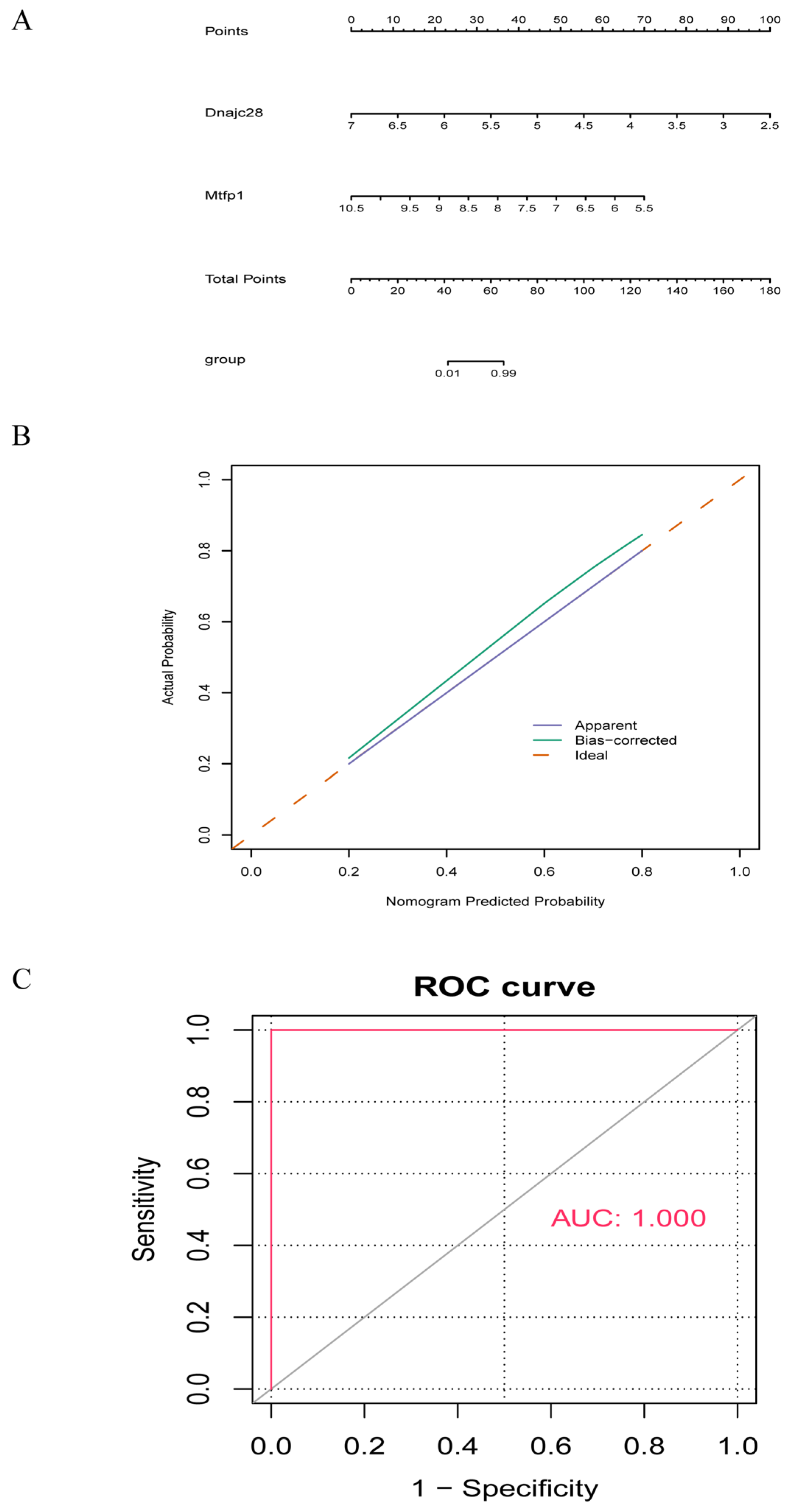 3.2. Identify DNAJC28 and MTFP1 as Biomarkers and Construct Nomograms