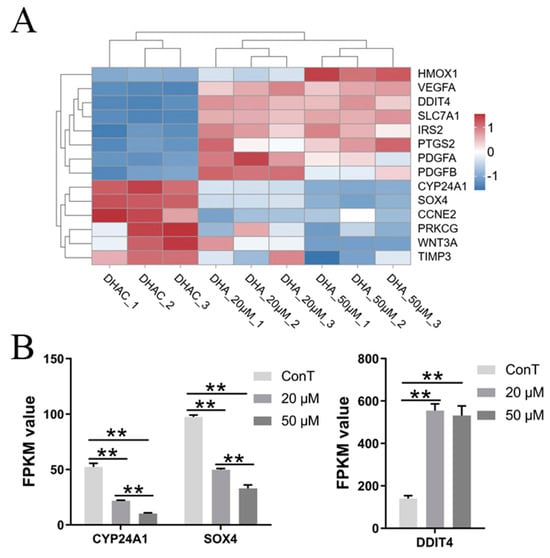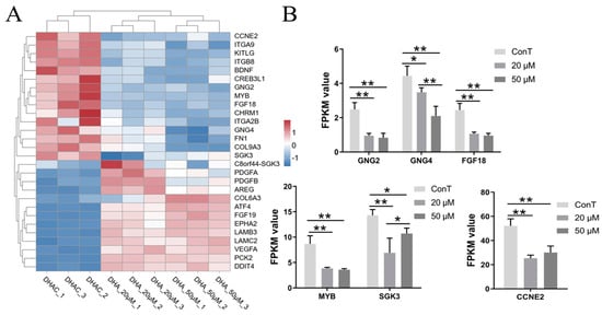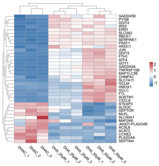 Numerous studies have demonstrated that DHA plays a significant role in anti-malarial, anti-inflammatory, antioxidant, and chemopreventive activities. In recent years, it has also been found to exhibit promising preventive and therapeutic effects against cancer [3]. Therefore, we performed a hierarchical clustering analysis of the DEGs involved in pathways related to the anti-cancer effects of DHA (Figure 3).