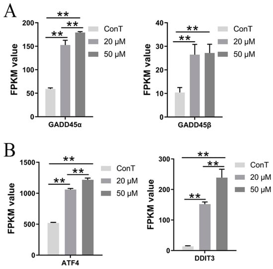 Transcriptome expression levels of (A) GADD45α/GADD45β and (B) ATF4/DDIT3. Data are presented as mean ± SD from n = 3 independent biological replicates. Statistical analysis was performed using one-way ANOVA followed by Tukey’s post hoc test compared to the control group. ** p < 0.01.