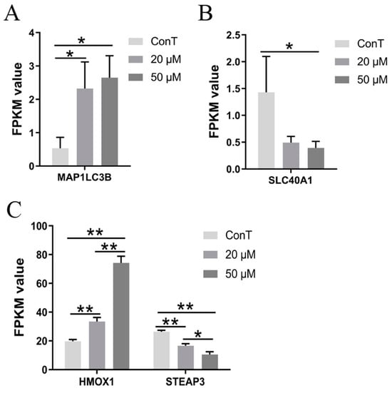 Transcriptome expression levels of genes related to the ferroptosis pathway ((A) MAP1LC3B, (B) SLC40A1, (C) HMOX1 and STEAP3). Data are presented as mean ± SD from n = 3 independent biological replicates. Statistical analysis was performed using one-way ANOVA followed by Tukey’s post hoc test and two-way ANOVA compared to the control group. * p < 0.05, ** p < 0.01.