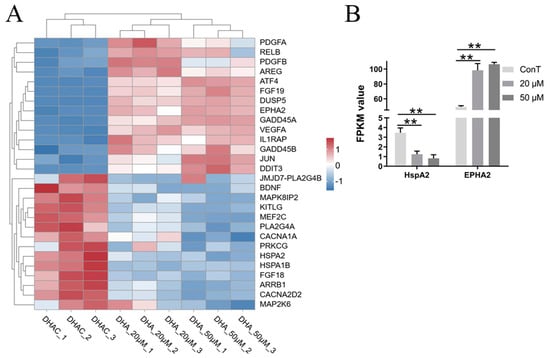 (A) Hierarchical clustering analysis of DEGs in the MicroRNAs pathway. Color scale: blue, downregulated gene expression; red, upregulated gene expression; white, no change. (B) Transcriptome expression levels of genes related to the pathway. Statistical analysis was performed using one-way ANOVA followed by Tukey’s post hoc test and two-way ANOVA compared to the control group. ** p < 0.01.