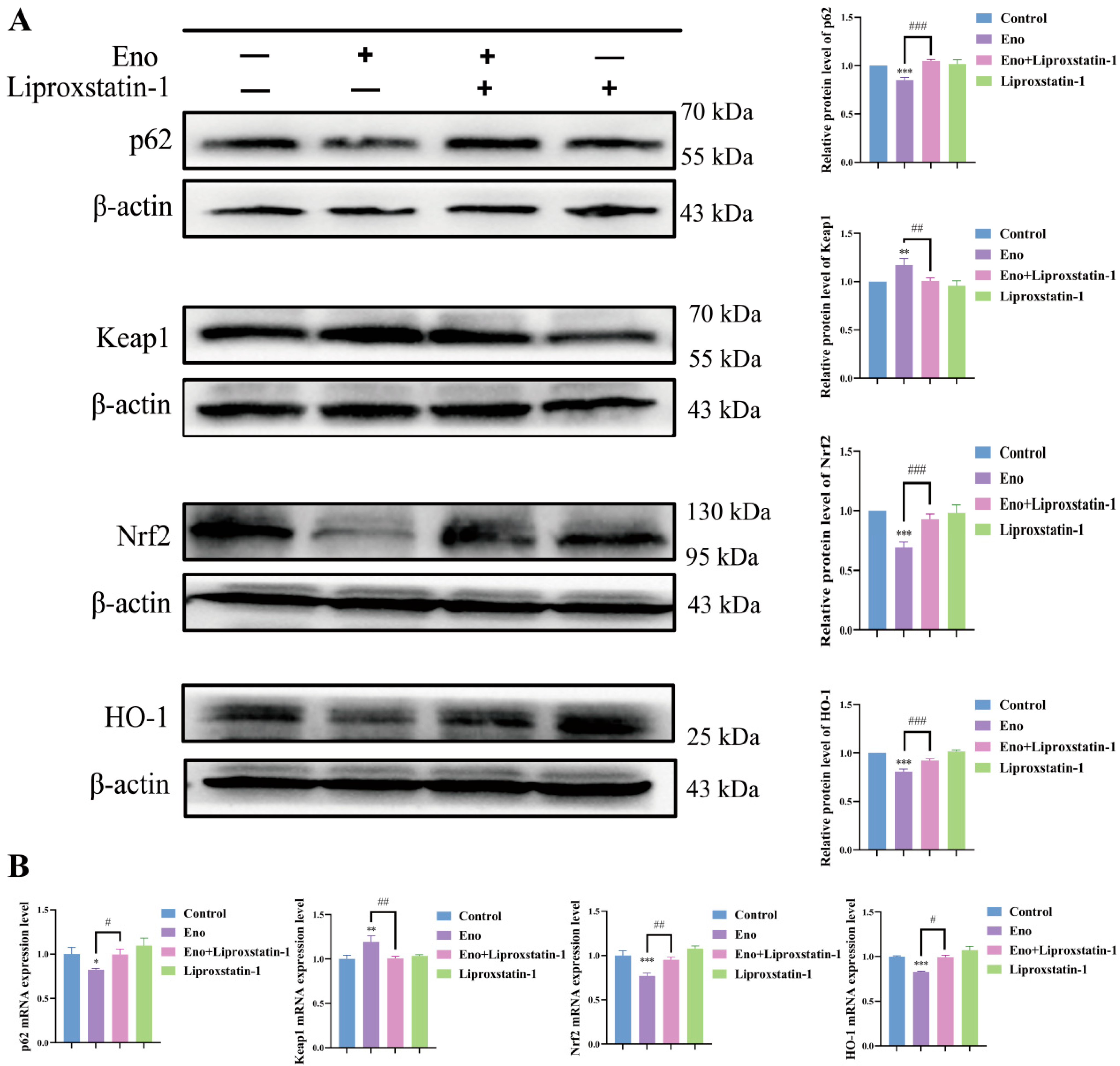 3.4. Eno-Induced Ferroptosis Is Associated with Suppression of the p62/Keap1/Nrf2/HO-1 Signaling Pathway in HepG2 Cells
