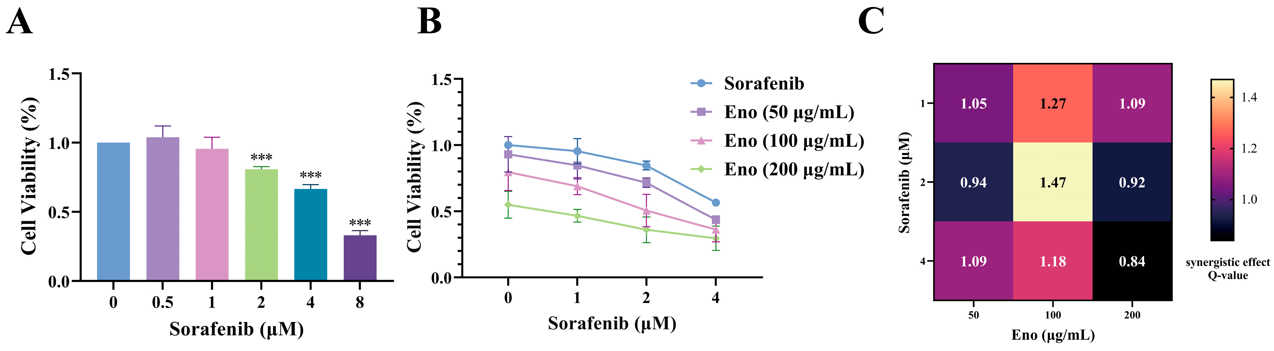 3.5. Eno and Sorafenib Exhibit Synergistic Cytotoxicity to HepG2 Cells