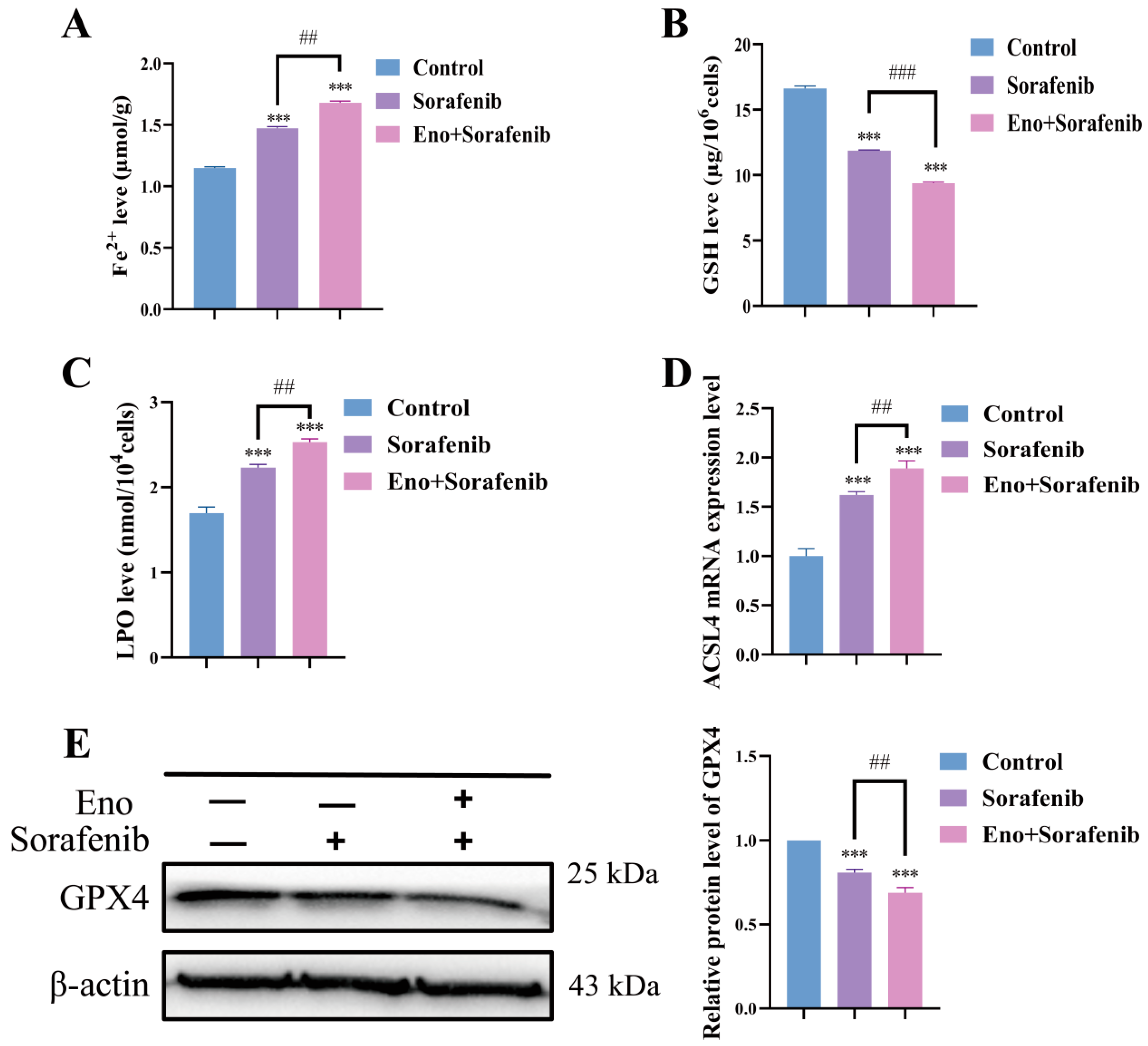 3.7. Eno Synergistically Promotes Ferroptosis in HepG2 Cells with Sorafenib