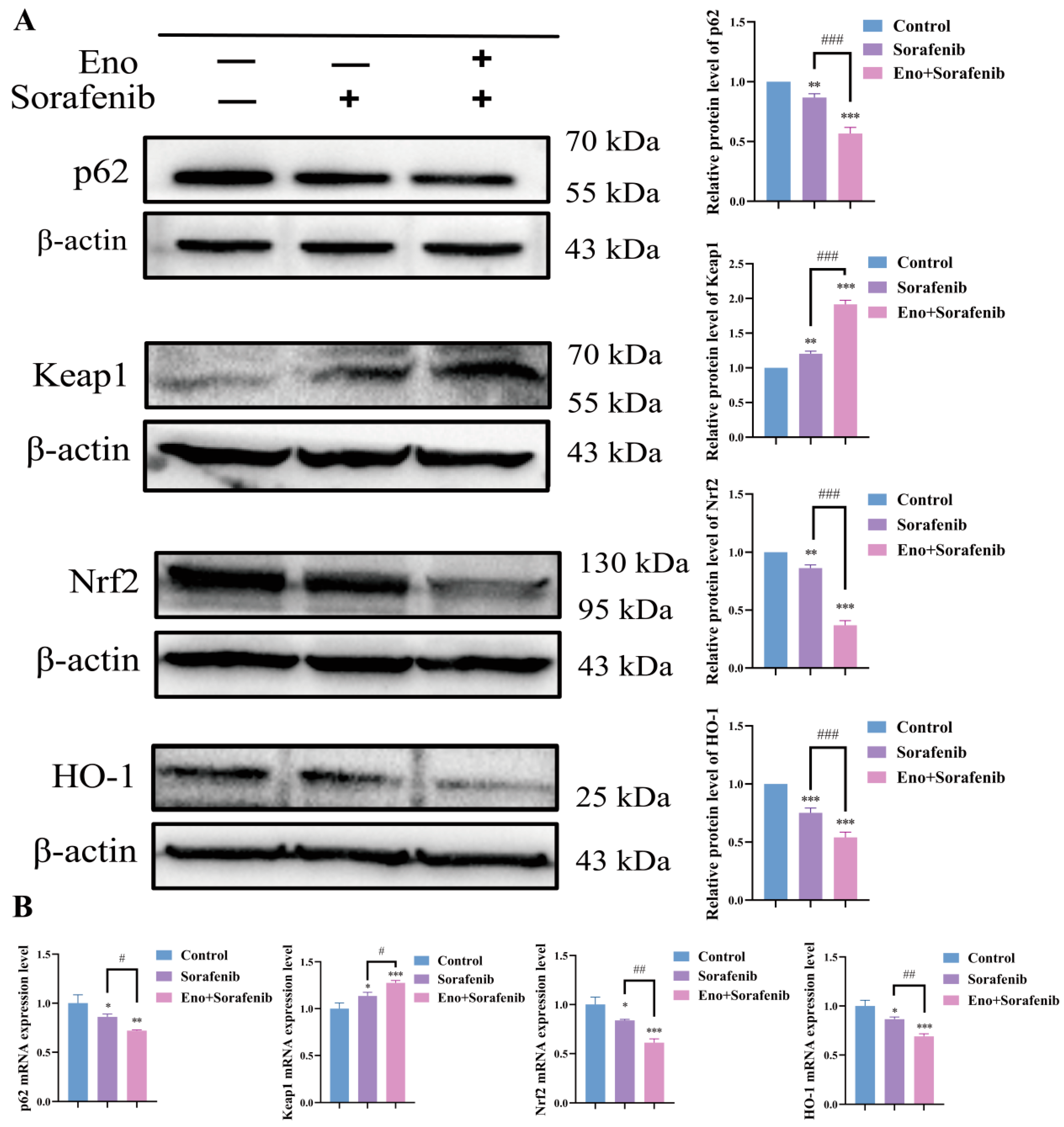 3.10. Eno Combined with Sorafenib Synergistically Inhibits the Progression of HCC Which Is Related to the Suppression of the p62/Keap1/Nrf2/HO-1 Signaling Pathway In Vivo