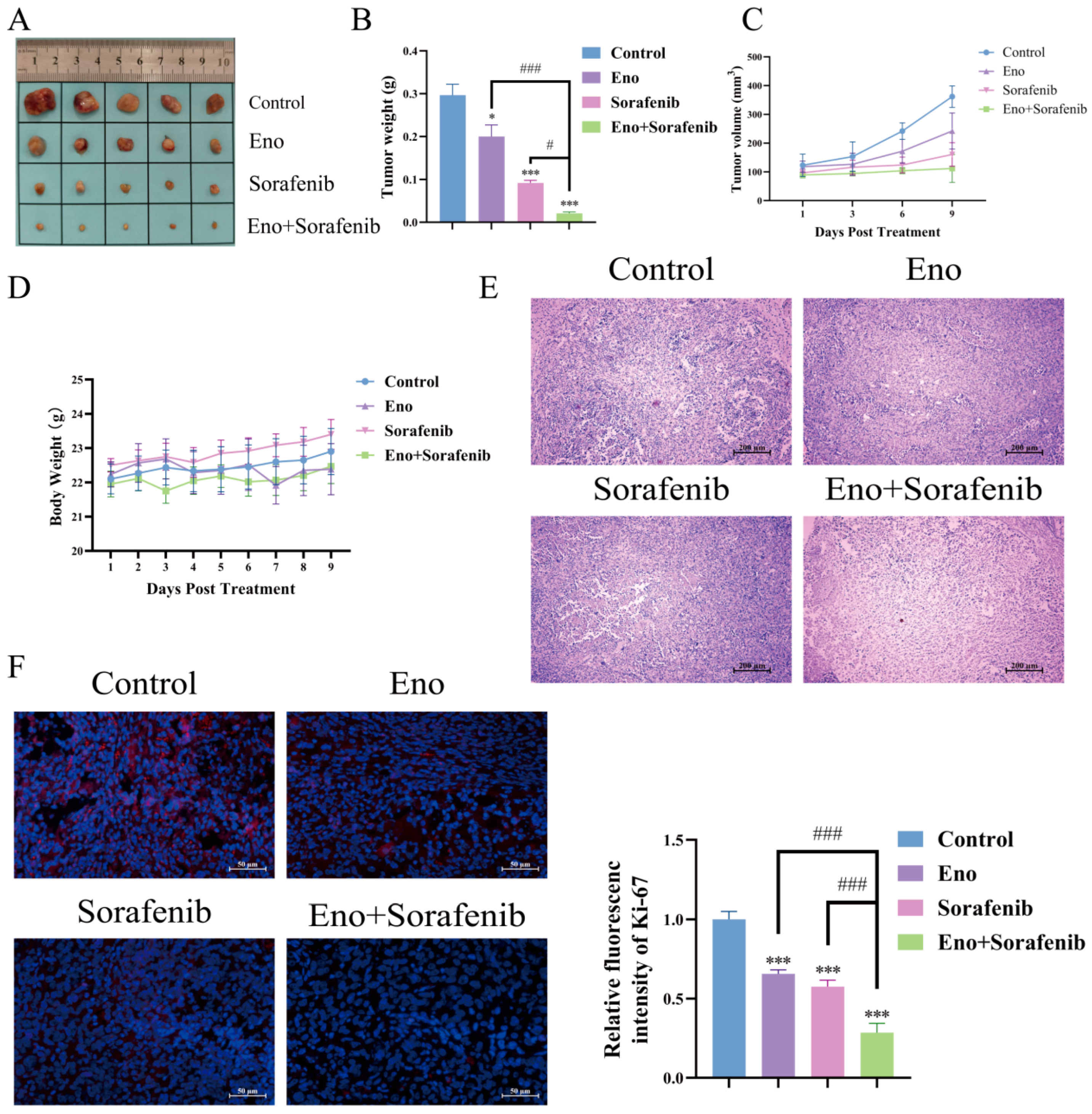3.9. Eno Combined with Sorafenib Synergistically Inhibits the Growth of Subcutaneous HCC Xenografts in Mice