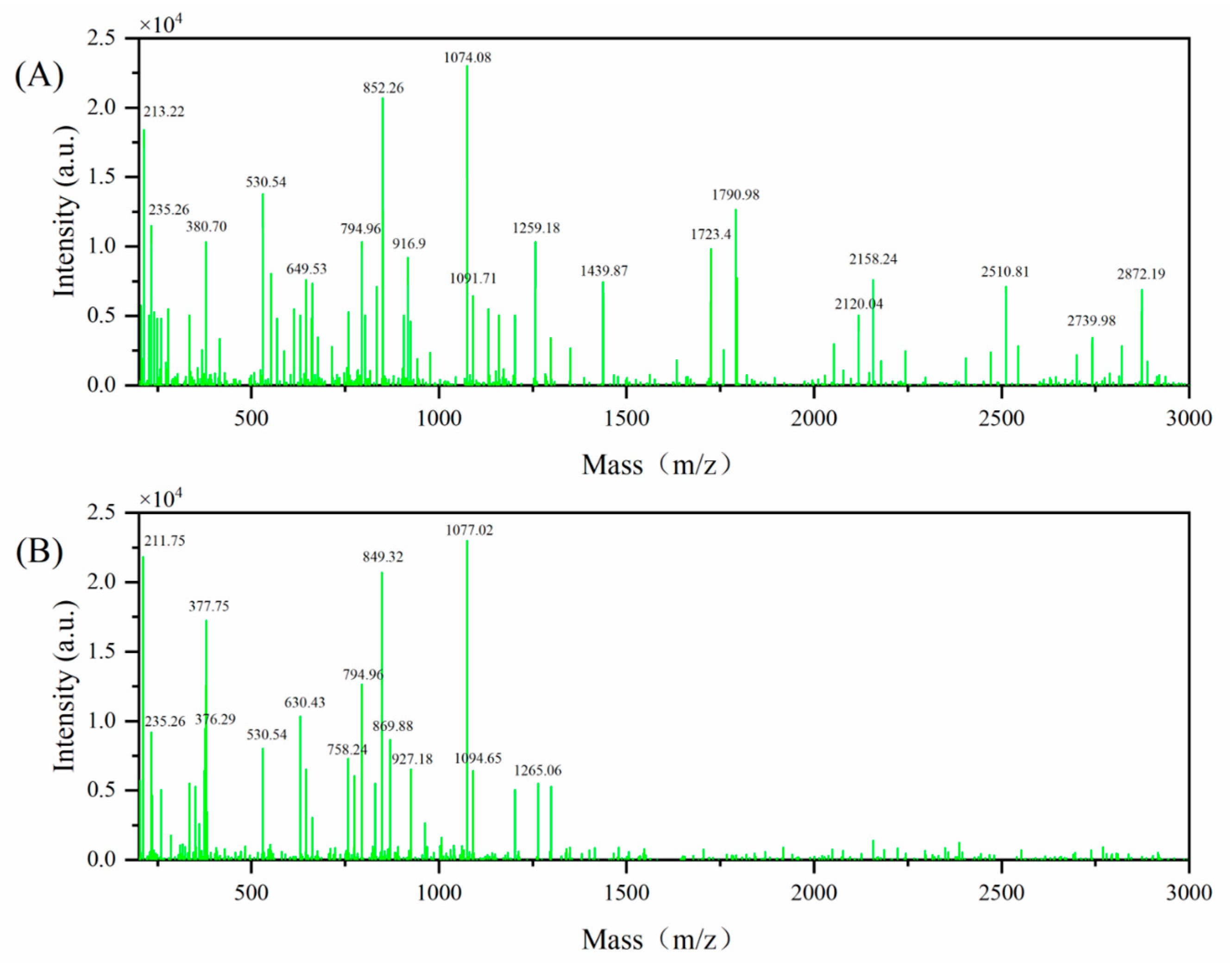 2.8. Molecular Mass Distribution by MALDI–TOF Mass Spectrometry