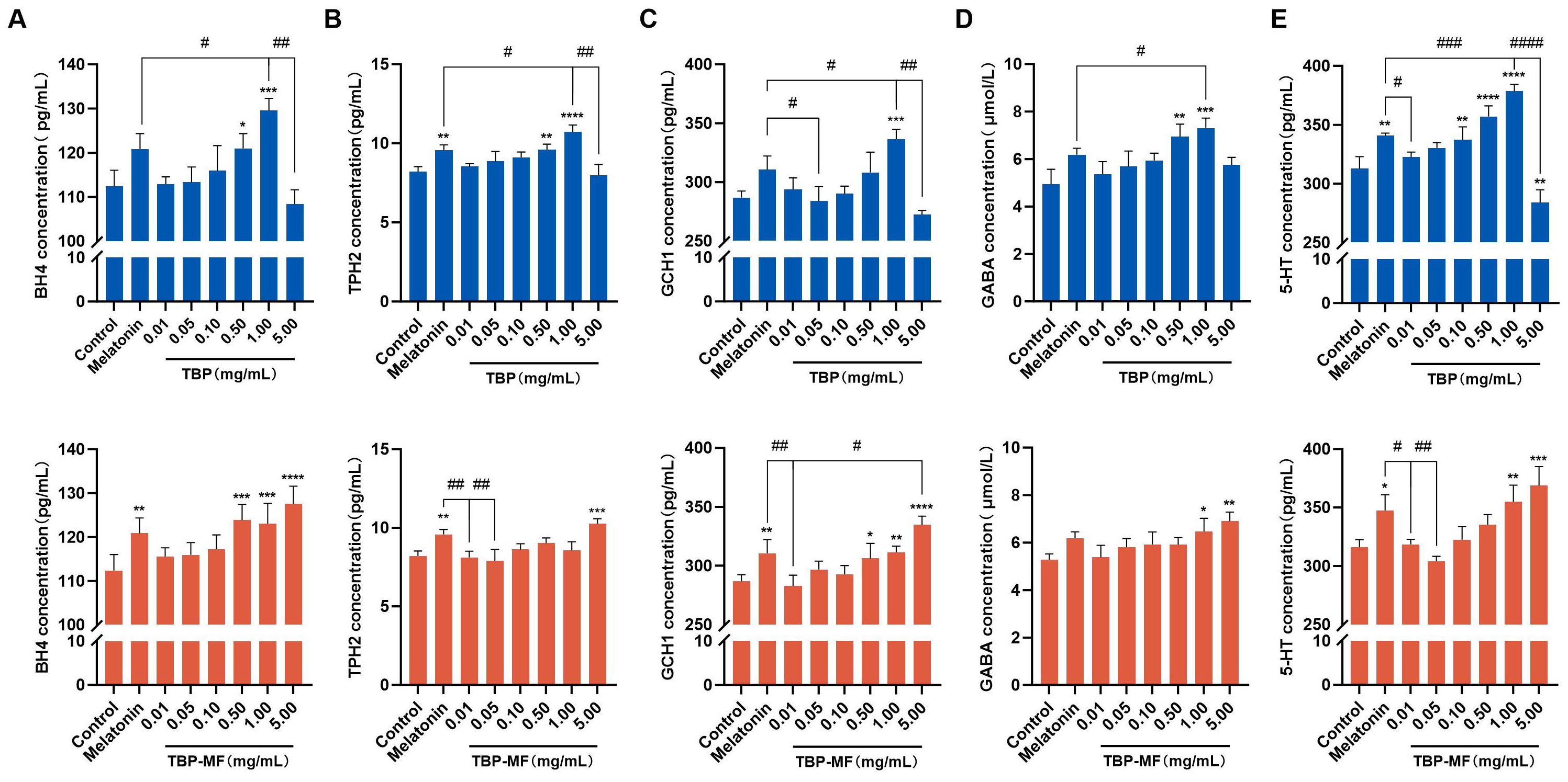 3.8. Effects of Tuna By-Product Peptides on the Upregulation of TPH2 and GCH1 and the Synthesis of Sleep Factors BH4, GABA, and 5–HT