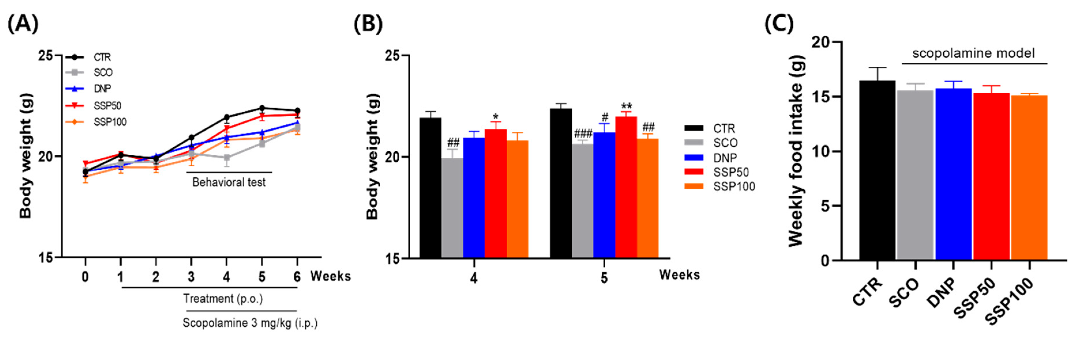 3.3. SSP50 Attenuates Scopolamine-Induced Body Weight Loss