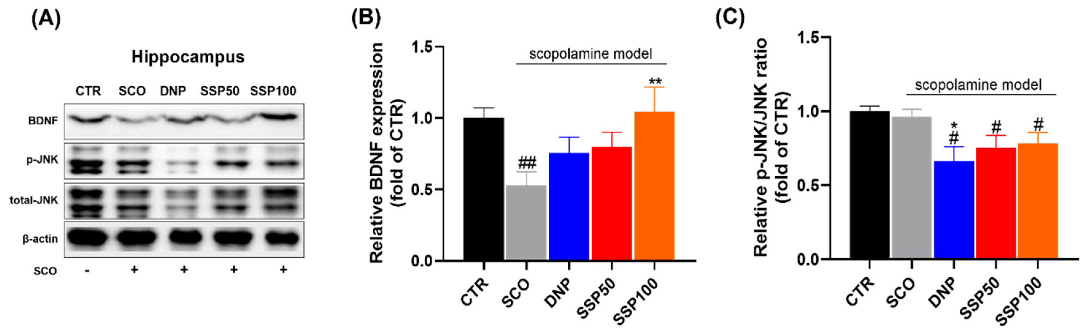 3.5. SSP Modulates BDNF Expression and JNK Activation in the Hippocampus