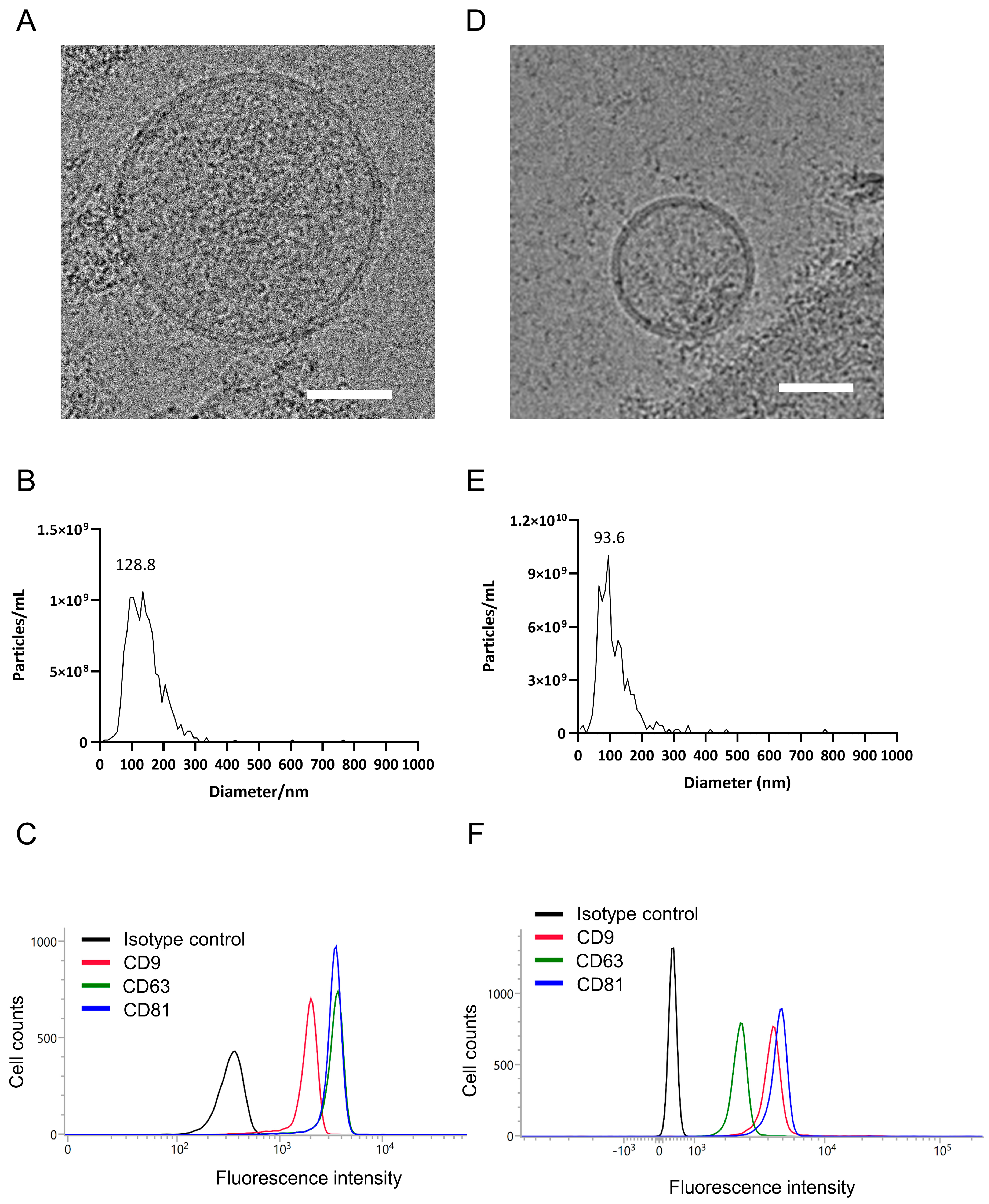 The presence of EV surface markers was confirmed by flow cytometry. EVs were captured using the Exosome-Human CD81 Flow Detection Reagent (Invitrogen™, Waltham, MA, USA, 10622D) and subsequently stained with PE-conjugated antibodies against CD9 (BD Pharmingen, San Diego, CA, USA, 555372), CD63 (BD Pharmingen, San Diego, CA, USA, 556020), and CD81 (BD Pharmingen, San Diego, CA, USA, 555676). PE-conjugated IgG1κ (BD Pharmingen, San Diego, CA, USA, 555749) served as the isotype control. Fluorescence signals were analyzed using a FACSLyric™ flow cytometer (BD Biosciences, San Jose, CA, USA).