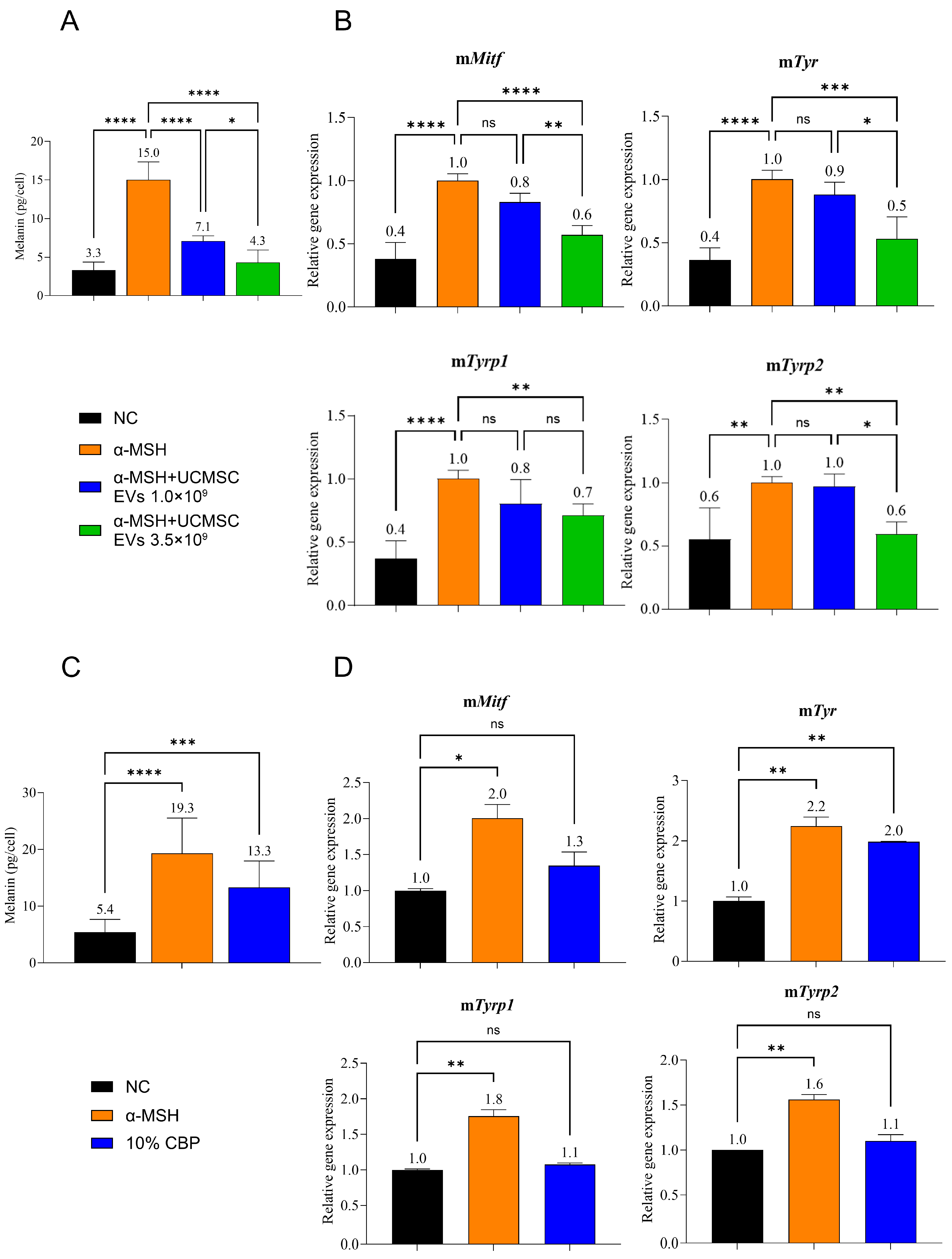 1]. In addition, vesicle-like particles were detectable in CBP preparations, which is expected since plasma naturally contains EVs together with soluble circulating components. The functional dichotomy was clearly established in B16F10 cells, where UCMSC-derived EVs dose-dependently suppressed melanin production and the mRNA expression of master regulator