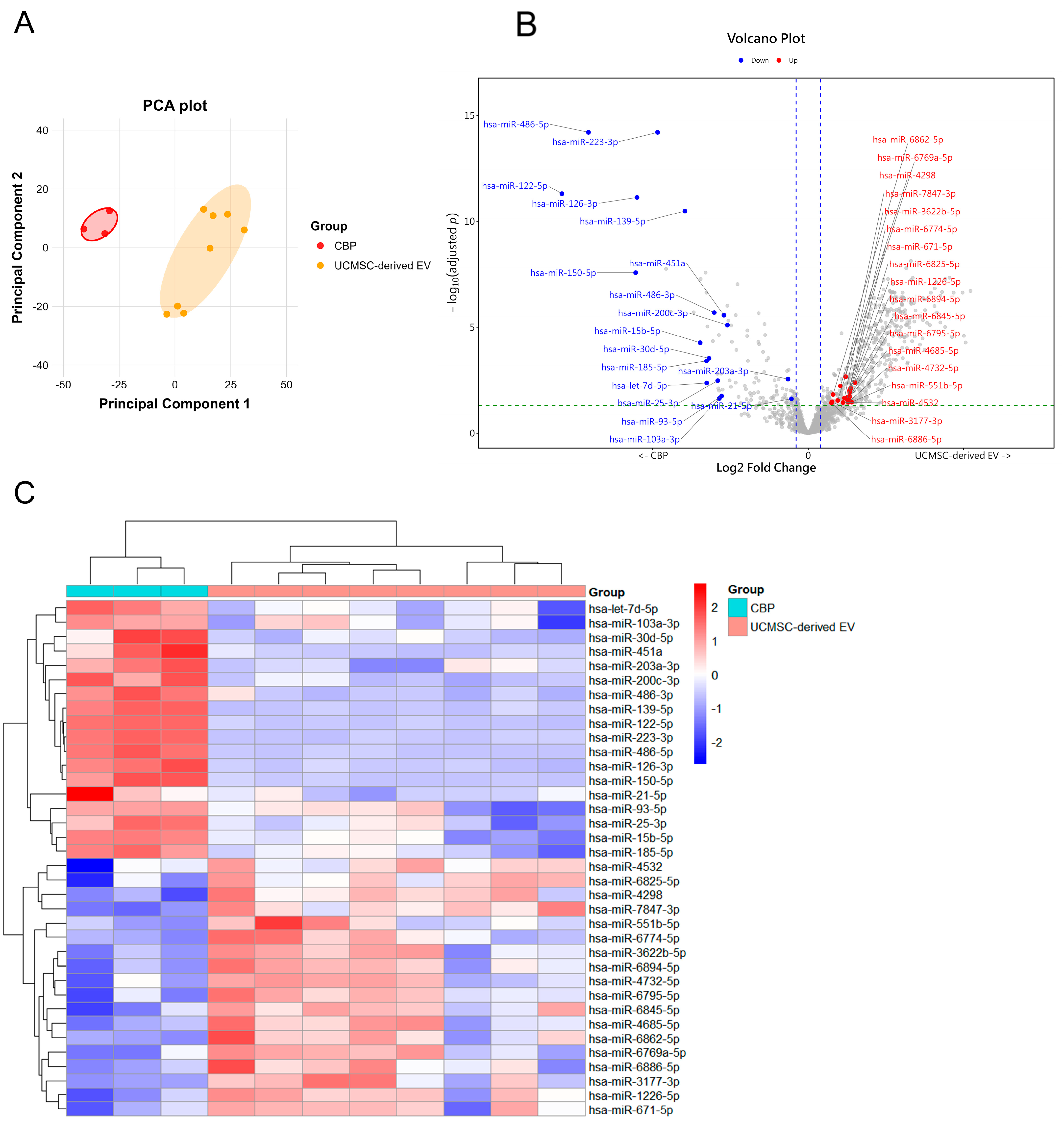 The core of our study was to move beyond functional observation to mechanistic insight. By employing an integrative omics approach, we successfully linked the functional differences to distinct molecular signatures. The clear separation of miRNA and protein profiles between UCMSC-derived EVs and CBP (