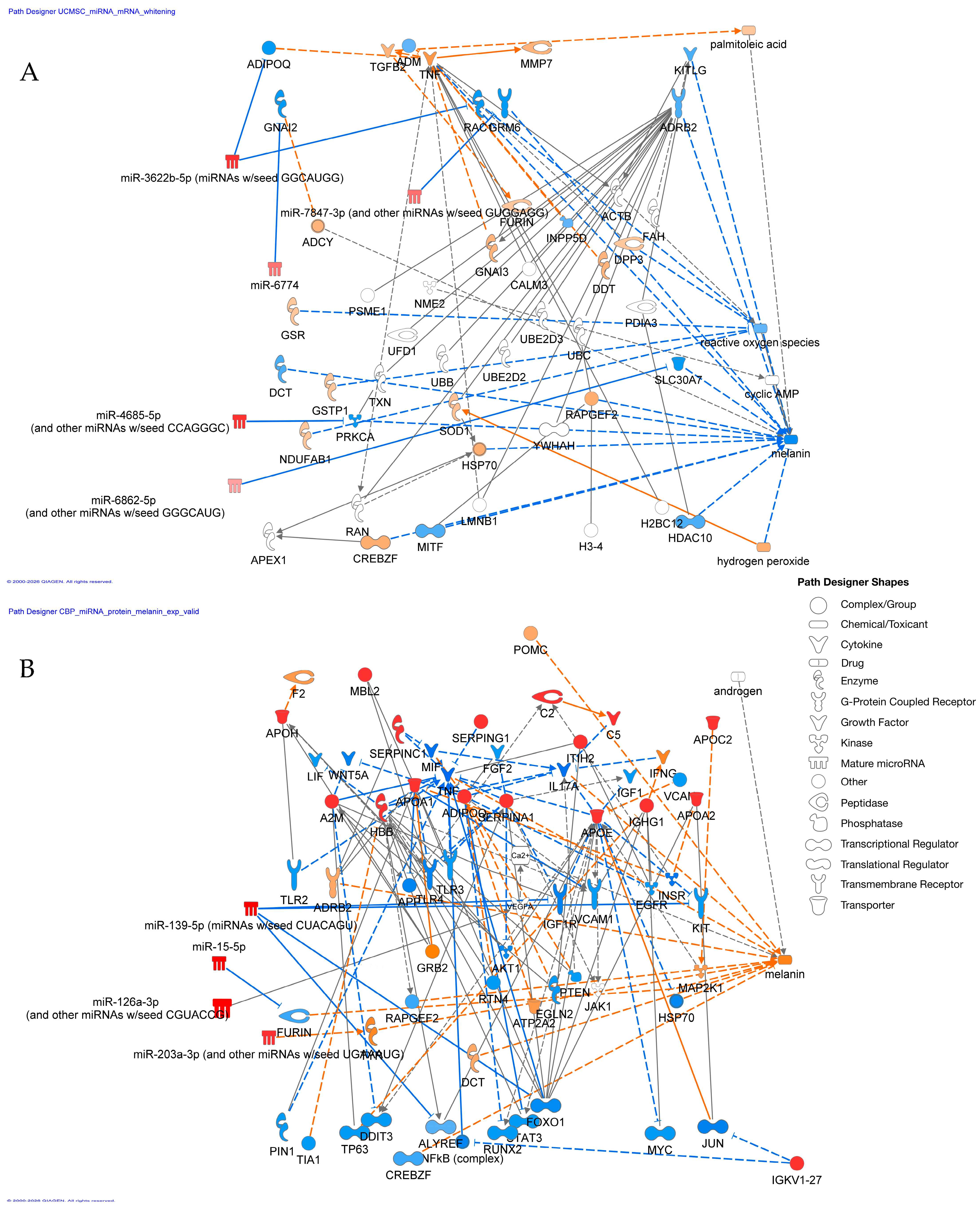 19]. This analysis helped to construct molecular networks and predict the functional impact of the differentially expressed molecules on melanogenesis pathways.