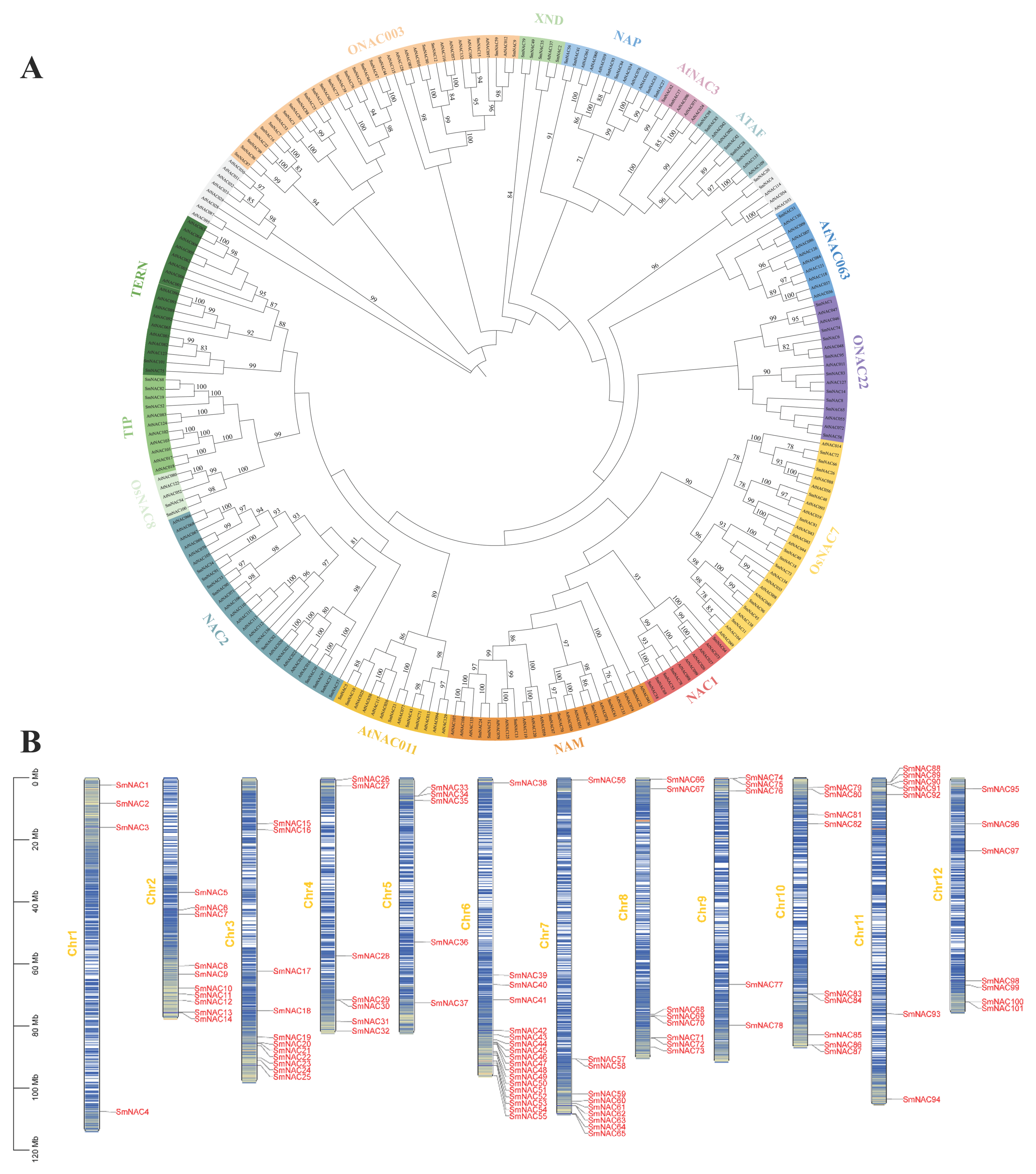 2.1. Identification and Chromosomal Distribution of NAC Genes in Eggplant
