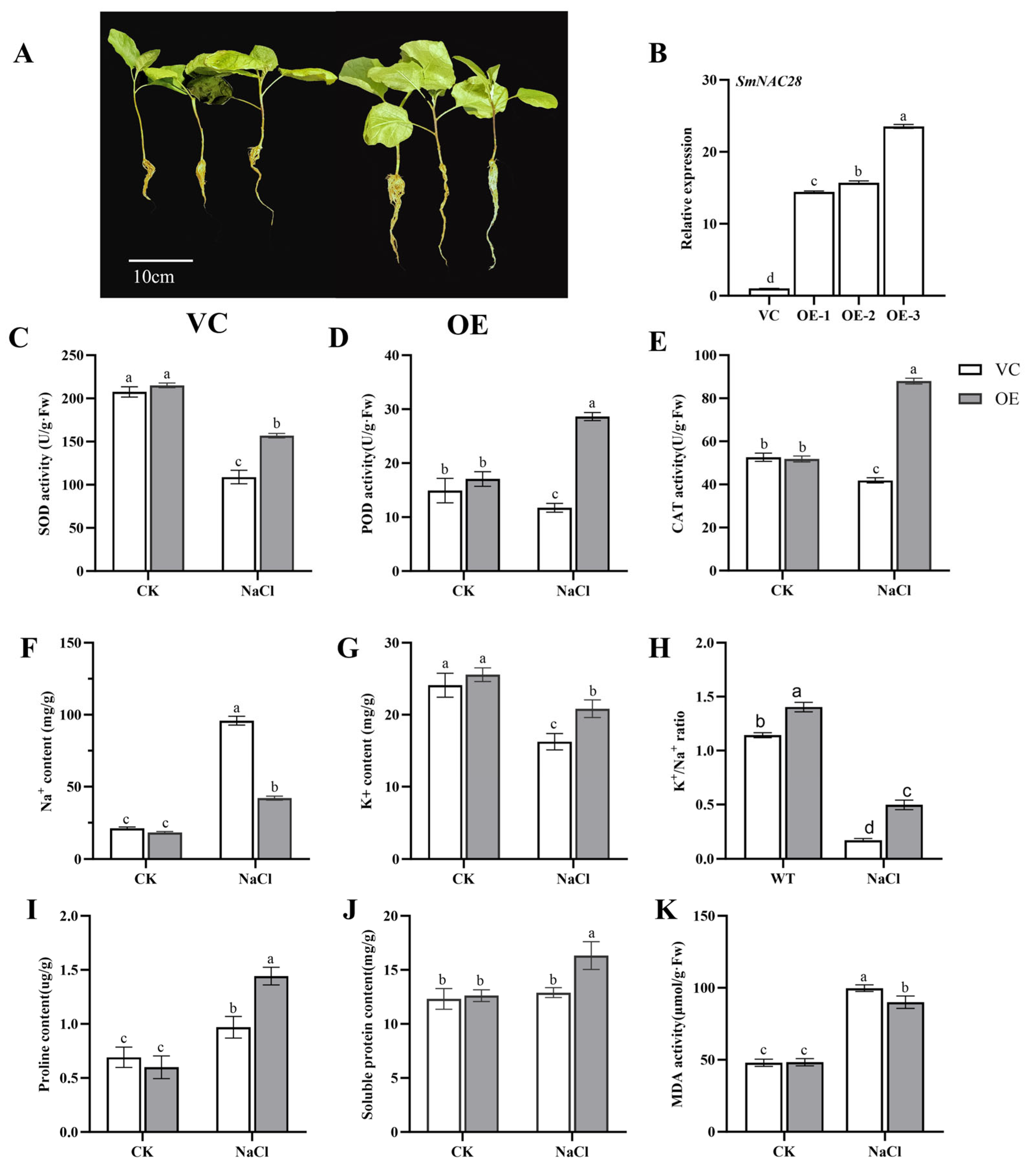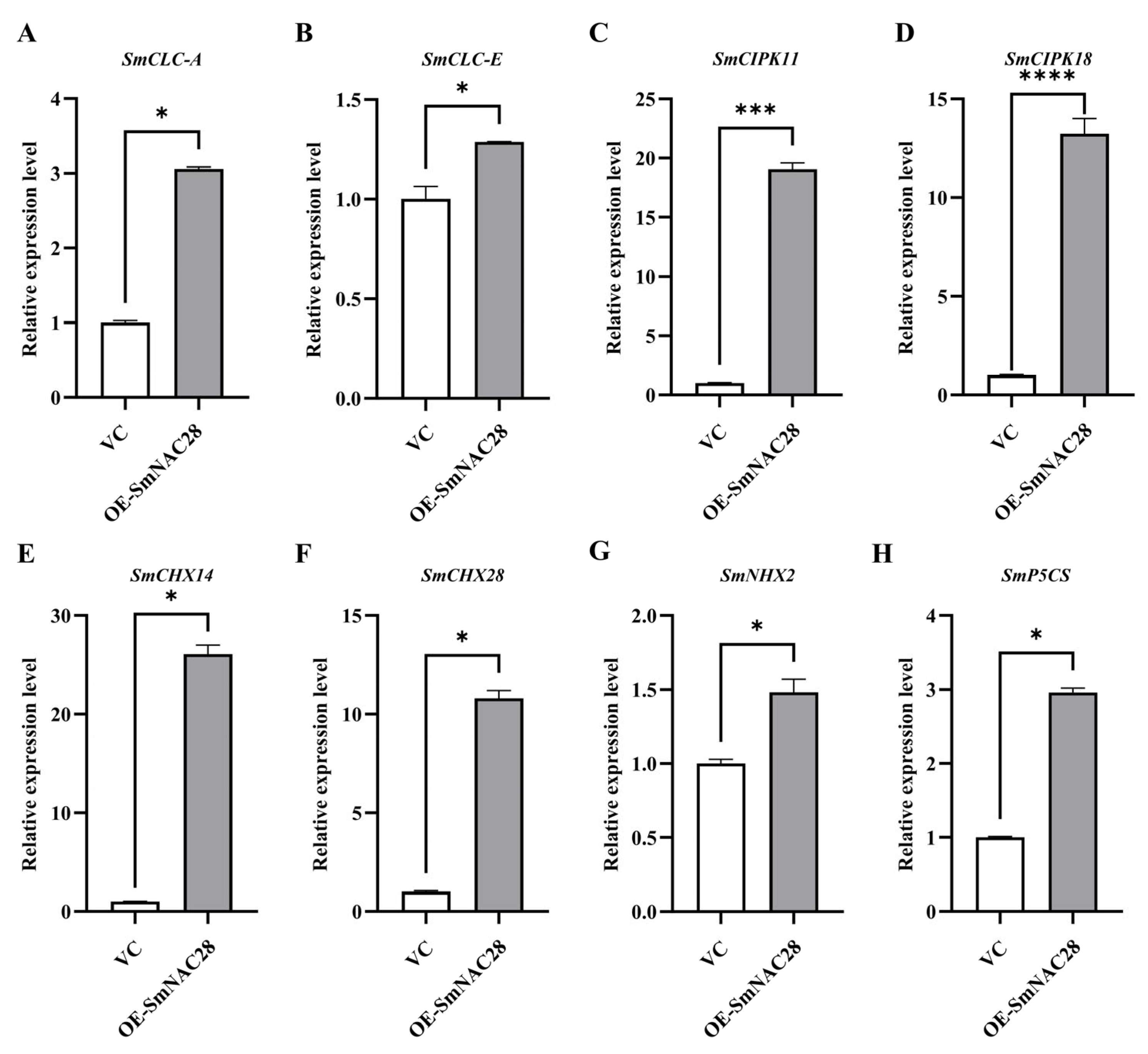 3.7. Functional Analysis of SmNAC28 Overexpression in Enhancing Salt Tolerance