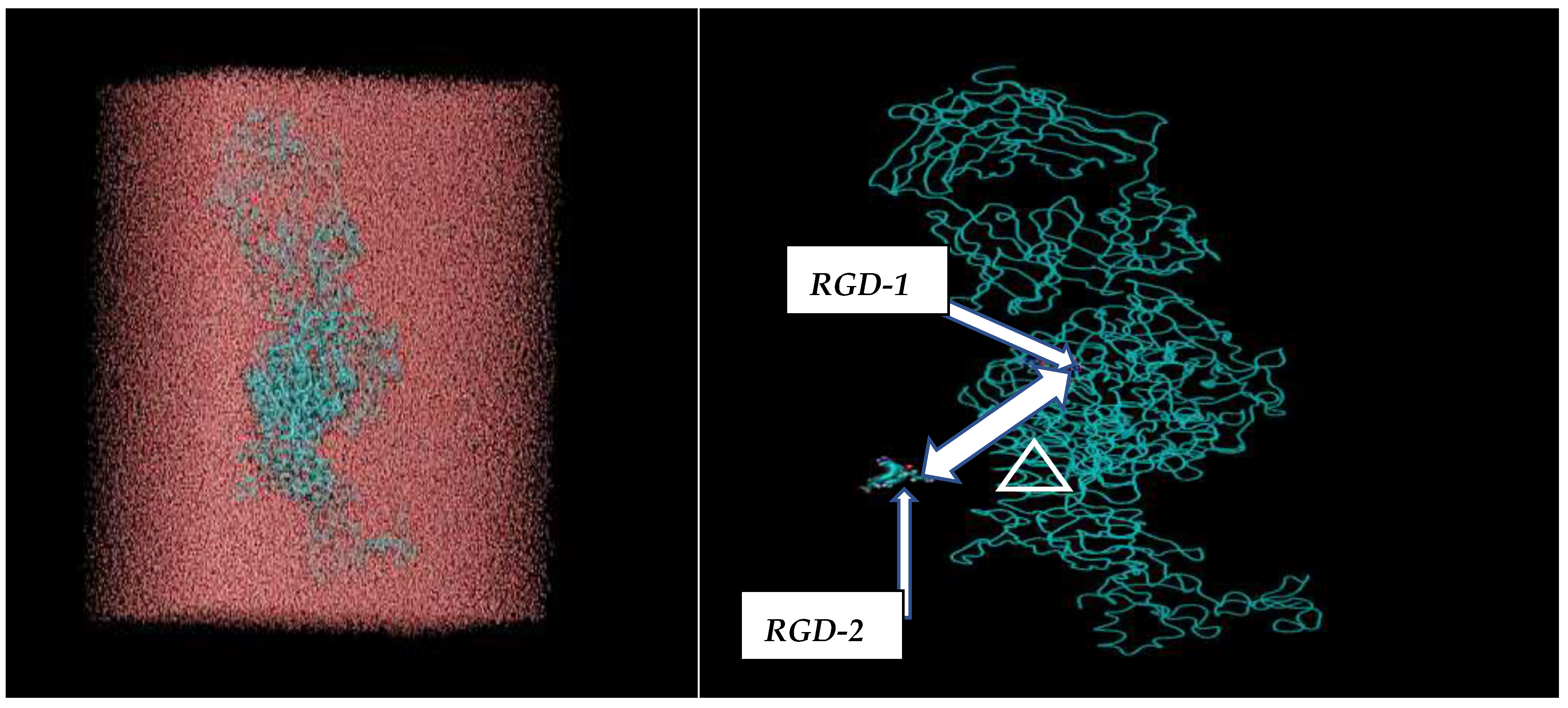 Figure 13, MD simulated multiple molecular configurations of the RGD peptides and αvβ3 integrin receptor illustrate and evaluate some possible binding mechanisms of the RGD-2 to αvβ3 integrin receptor + RGD-1 during a single-particle or multiparticle (cluster) boron atom delivery to the receptor. The MD results may shed light on possible delivery routes for specific boron(s) to tumor(s). In particular, the computer-designed RGD-2-peptide + boron(s) and receptor + RGD-1-peptide that MD modeled above fully correspond to their structural behavior in vivo. The (GLY, PRO) amino acids contribute hydrophobicity and lack of charge in their side chains; the (ARG) at the peptide’s termini signifies a positively charged side chain in neutral aqueous solutions, stemming from an isoelectric point significantly above 7.0, leading to a net positive charge under these conditions (it is worth noting that proteins dominated by such amino acids are designated as alkaline, reflecting their isoelectric points also exceeding 7.0); the (ASP), in contrast, carries a negative charge on its side chain, with an isoelectric point below 7.0; and finally, the (SER) is an amino acid with a hydrophilic, uncharged side chain, which confers the ability for protein regions containing it to undergo hydration and engage in hydrogen bonding with other similar residues. In principle, the MD analysis offers atomic–molecular insights into the RGD peptide’s localization and conformation within the αvβ3 integrin receptor’s binding site. This is particularly relevant given the widespread interest in understanding peptide–protein, protein–protein, and membrane–receptor/enzyme interactions in modern life sciences. Such studies often necessitate considering chemical interactions with solvent molecules and specific surface fragments. Generally, these investigations are crucial for applications in nanobiotechnology and biochemistry, among other fields, and involve a complex interplay of hydrogen, hydrophobic, ionic, and electrostatic forces.