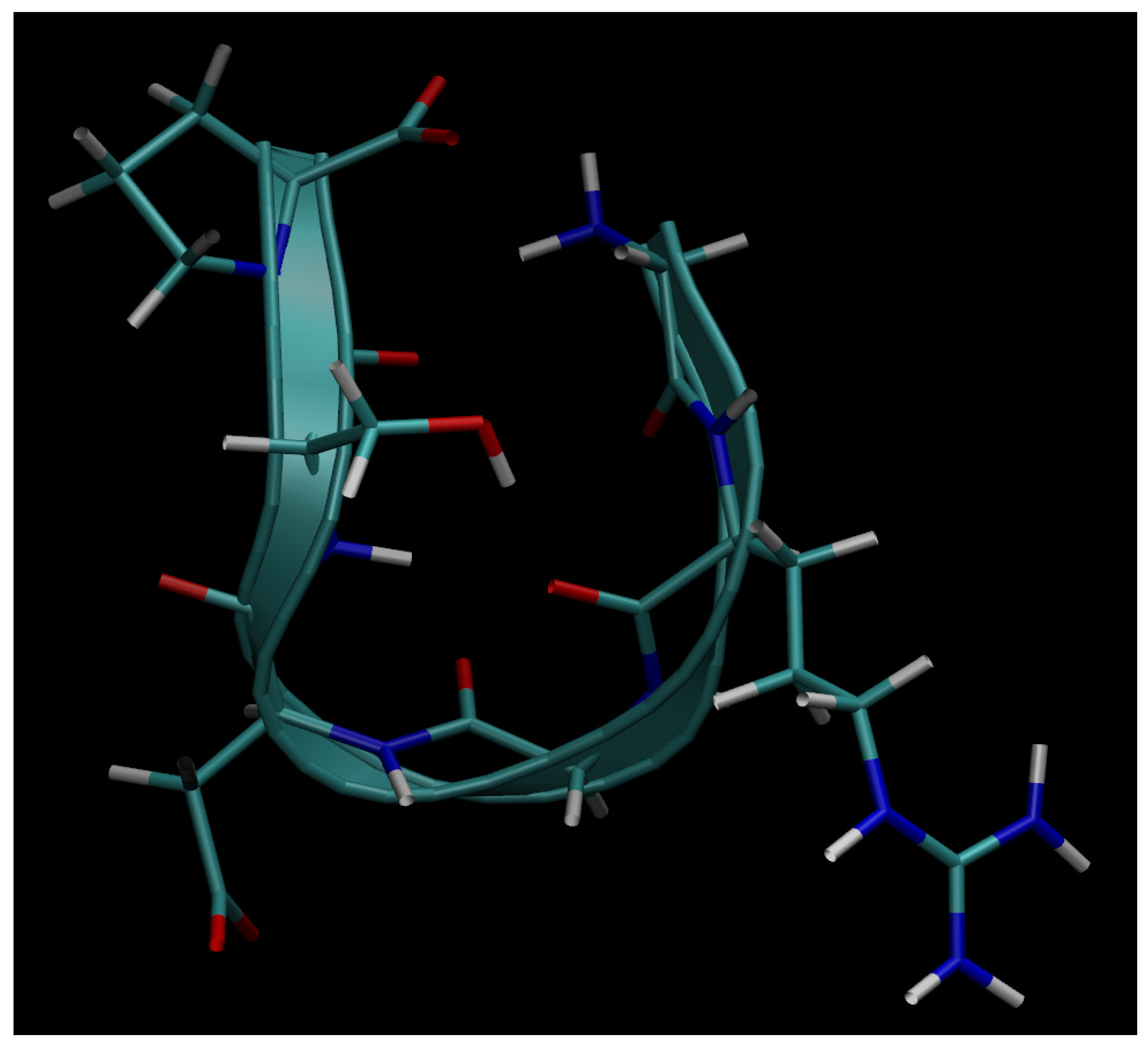 For the numerical MD simulation implemented in this study, the multifunctional AMBER-18 package with a fast implementation of the “pmemd.cuda” module on a CPU/GPU cluster machine is used. The numerical experiment significantly accelerates the performance of the AMBER-18 computer code (“pmemd.cuda”) and is aimed at the specificity or binding of the RGD peptide system (a detailed structure is shown in