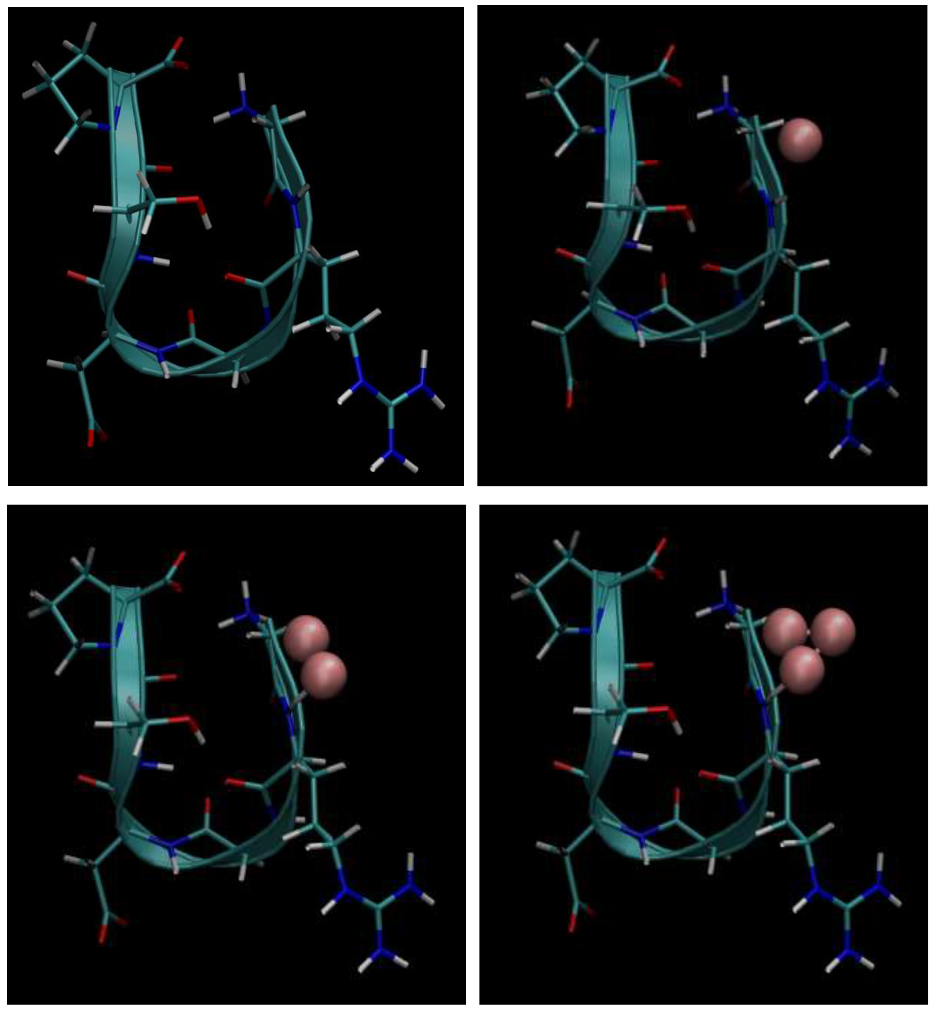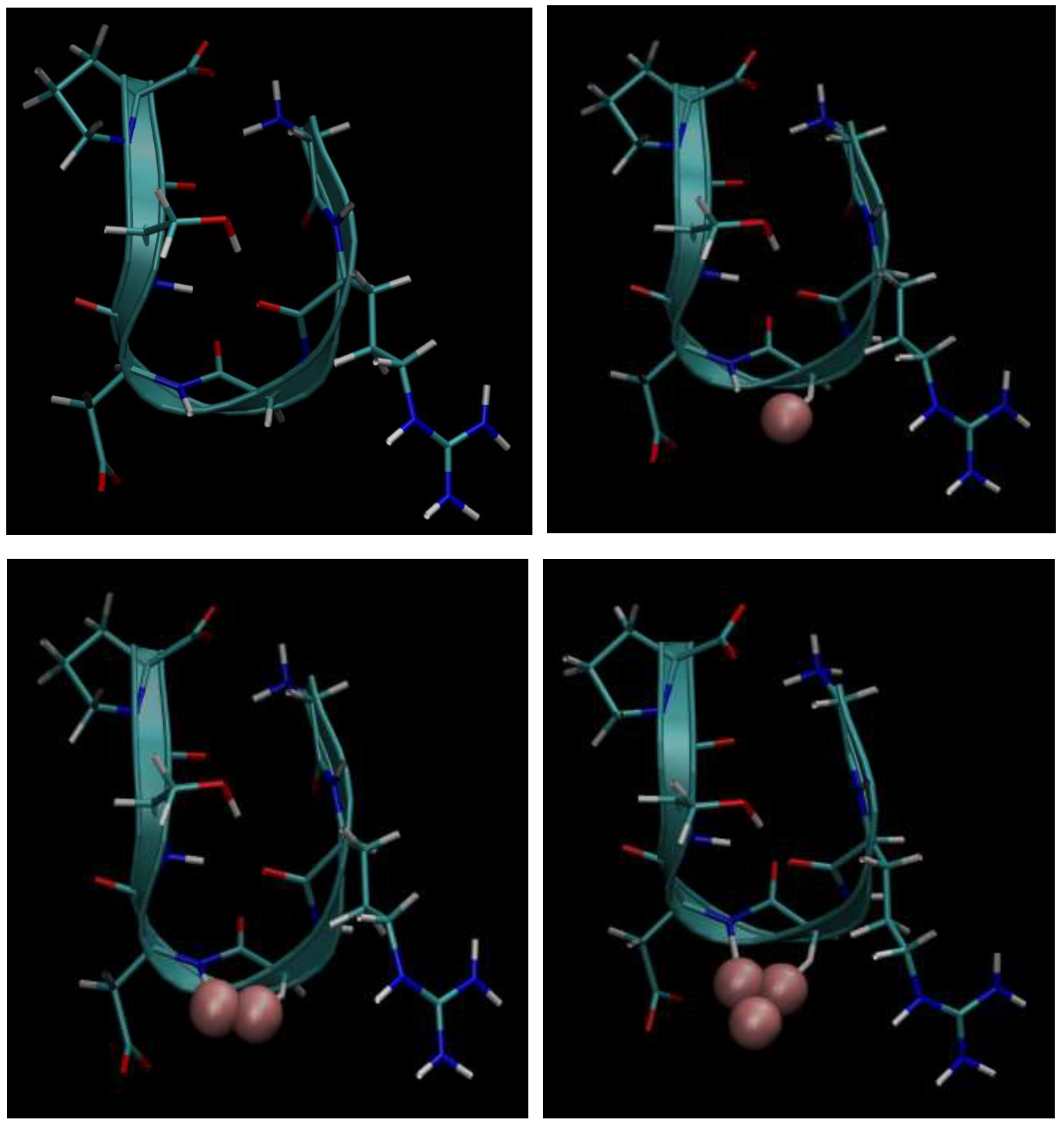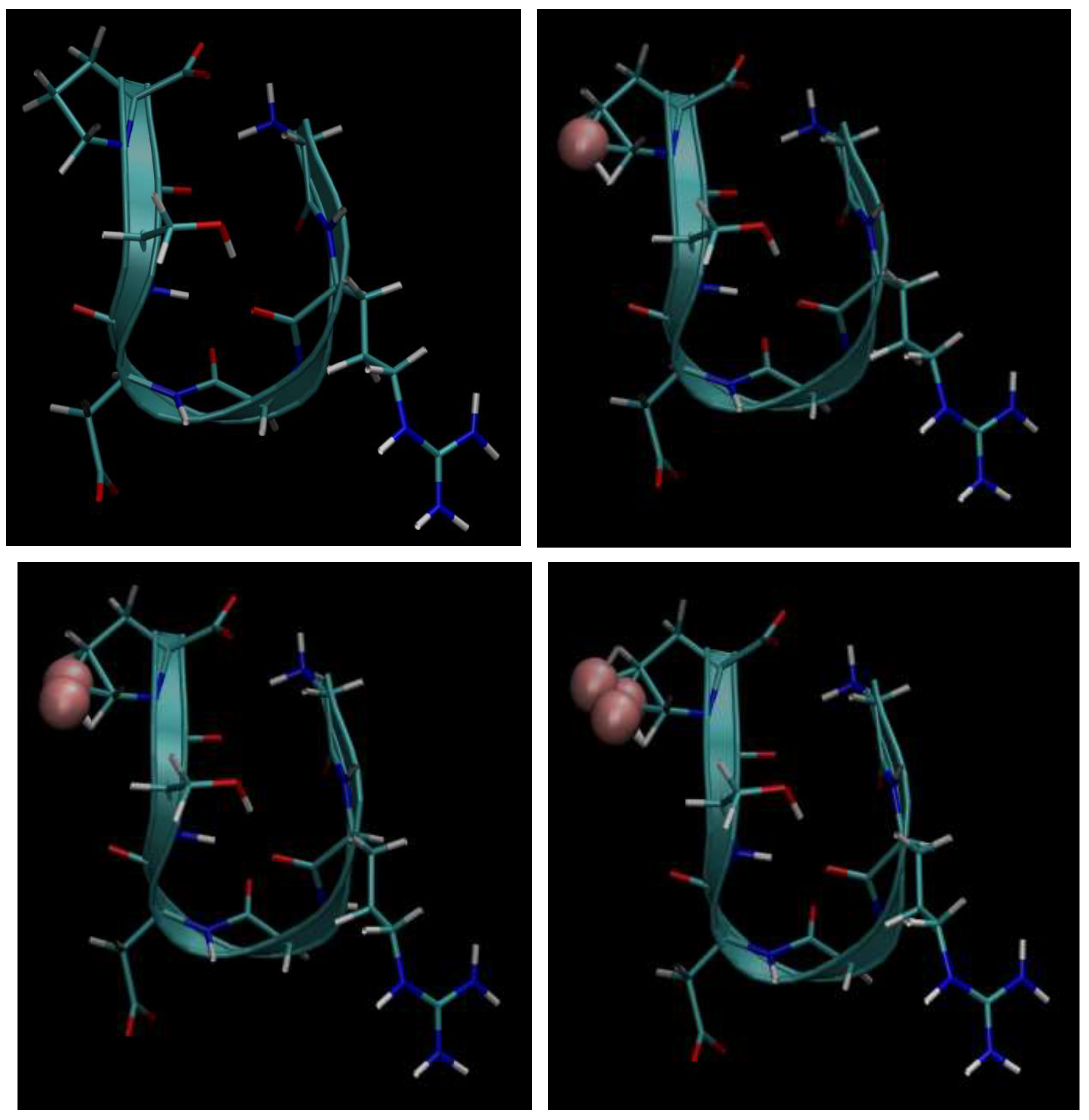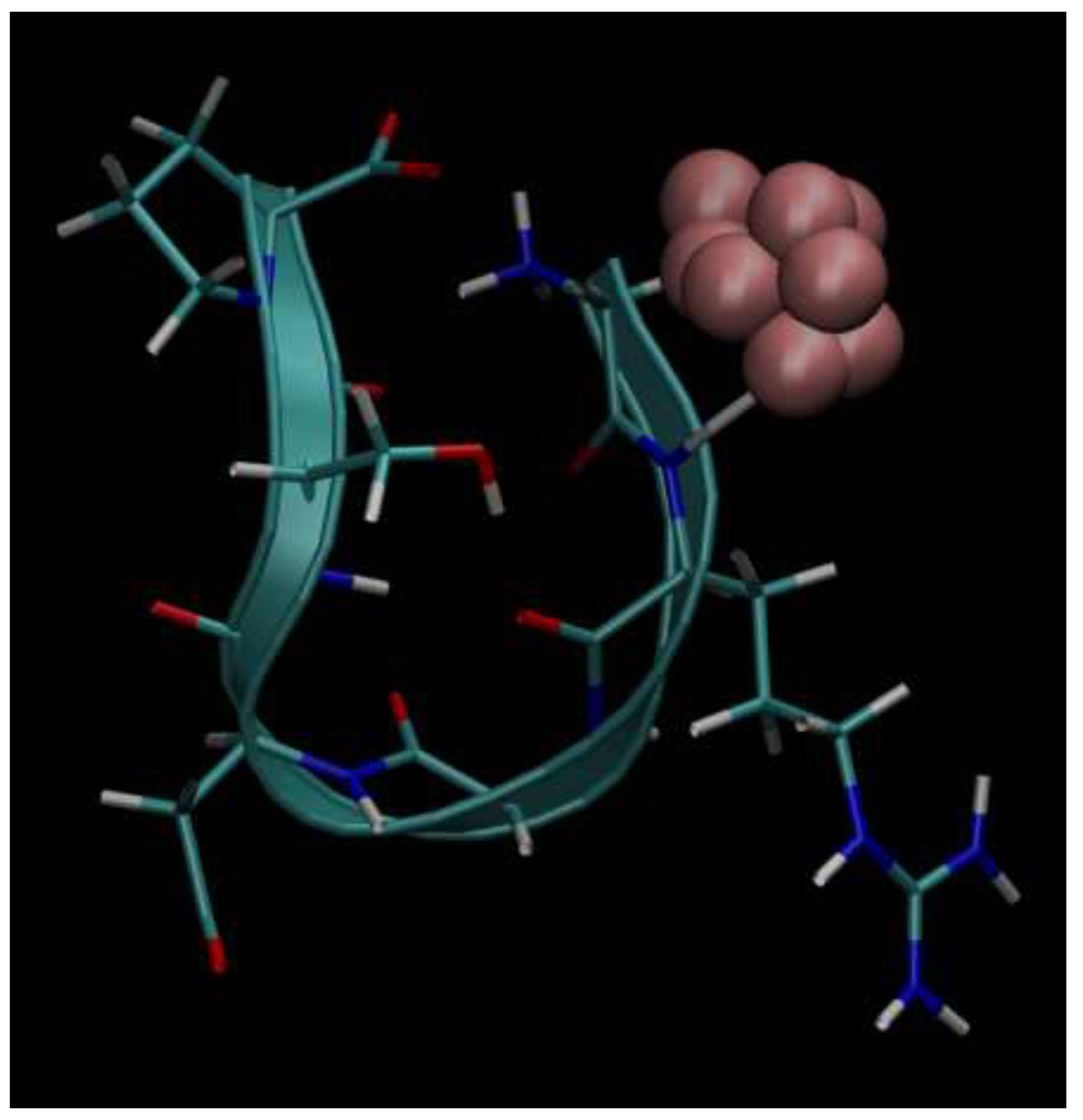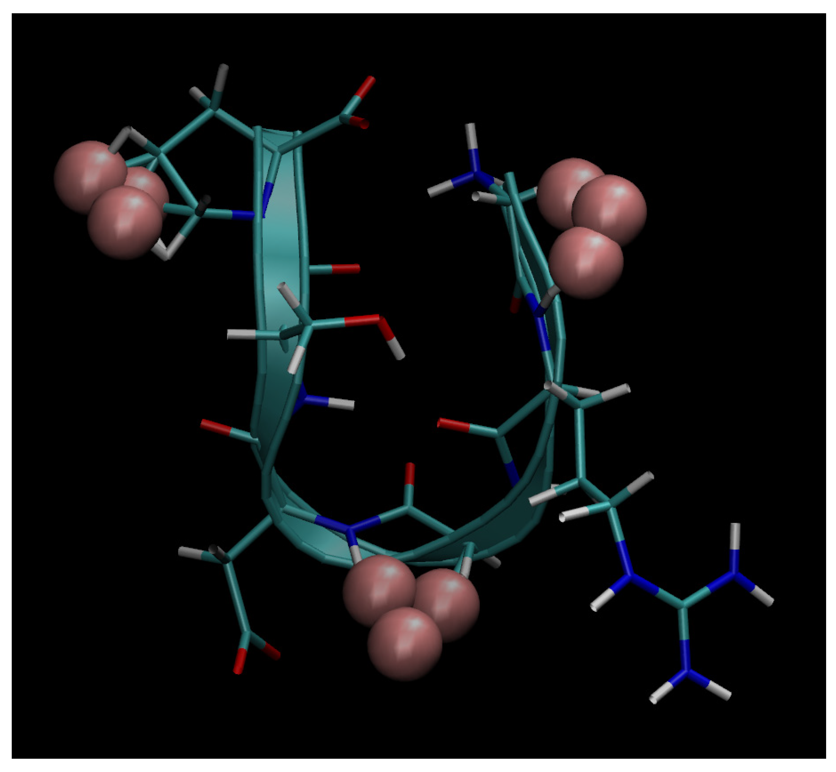 Figure 10, we present the multiple molecular configurations of the RGD peptides and αvβ3 integrin receptor to evaluate the possible binding mechanism of the RGD to αvβ3 integrin during single-particle or multiparticle (cluster) delivery of boron atoms to the receptor. The MD results may shed light on possible pathways for specific boron delivery to tumors. The RGD peptide begins and ends with (GLY, PRO), amino acids that contribute hydrophobicity and lack charge in their side chains. The presence of (ARG) at the peptide’s termini signifies a positively charged side chain in neutral aqueous solutions, stemming from an isoelectric point significantly above 7.0, leading to a net positive charge under these conditions. Proteins dominated by such amino acids are designated as alkaline, reflecting their isoelectric points also exceeding 7.0. In contrast, (ASP) carries a negative charge on its side chain, with an isoelectric point below 7.0. Finally, SER is an amino acid with a hydrophilic, uncharged side chain, which confers the ability for protein regions containing it to undergo hydration and engage in hydrogen bonding with other similar residues. The generated multiple MD configurations in