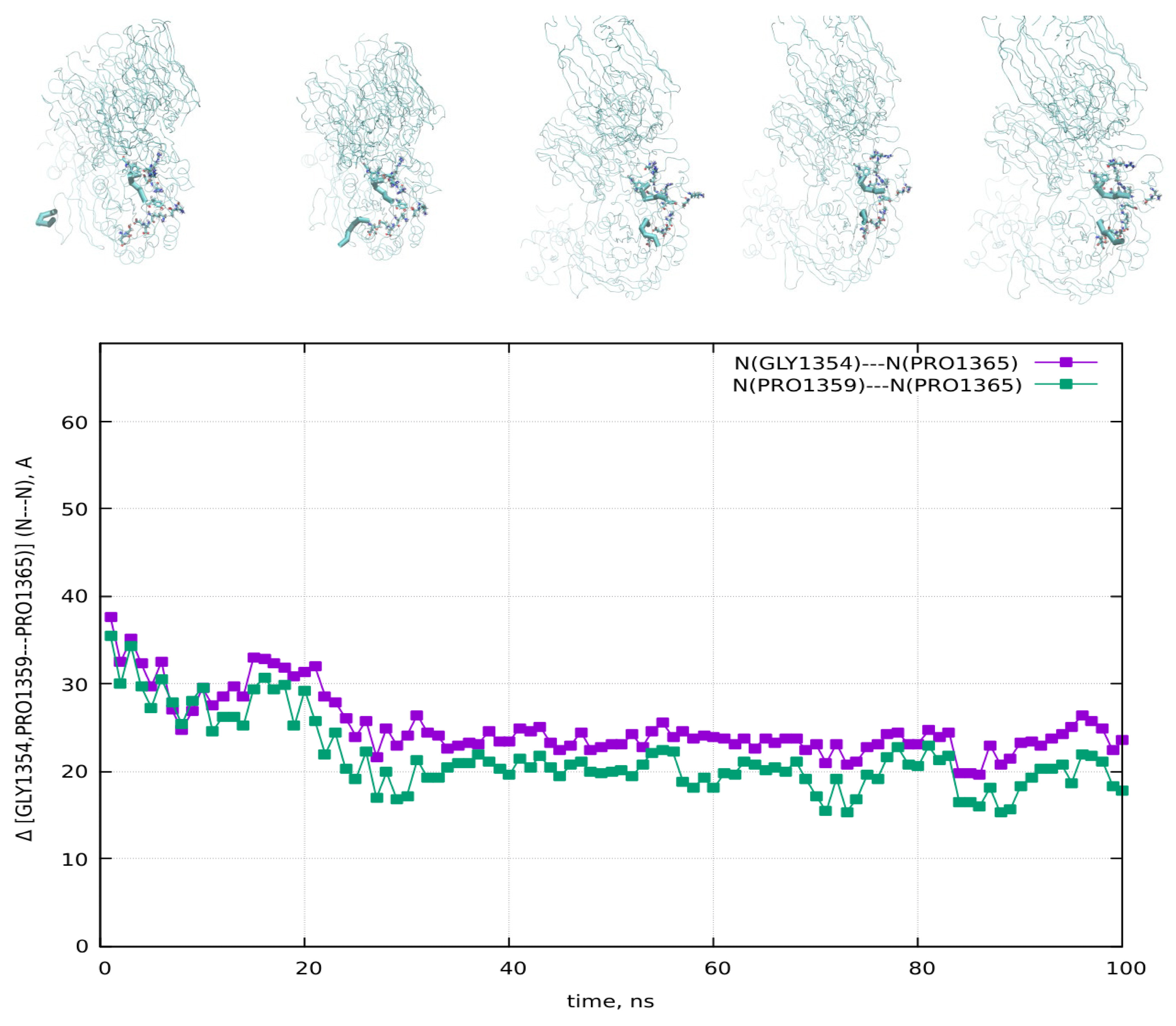 Figure 4, allowed for the computation of all potential distances between the RGD-1 (GLY, PRO) and RGD-2 (GLY, PRO) peptides. These MD findings, visualized as distance plots in