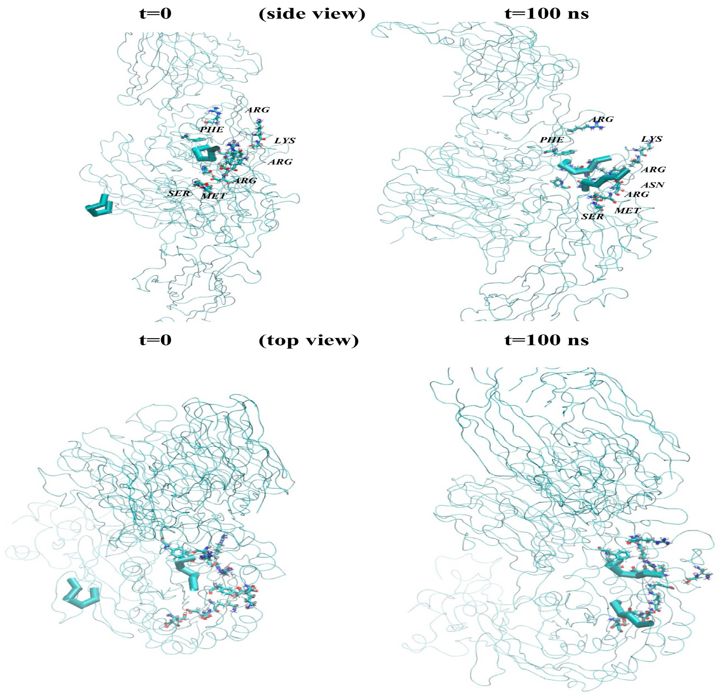 Figure 15 present the comparative molecular arrangements of the RGD-1 and RGD-2 peptide vectors within the αvβ3 integrin receptor. These illustrations depict the initial (t = 0) and final (t = 100 ns) relaxed states, offering both side and top perspectives. Collectively,