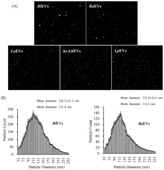 In order to confirm the morphology, including diameter and particle concentration, of the extracellular vesicles isolated by ultracentrifugation, nanoparticle tracking analysis was conducted with a ZetaView TWIN (Particle Metrix, Meerbusch, DE). PB-EVs (including L. holzapfelii isolated from the human scalp) suspended in filtered DPBS at 22.93 °C were irradiated with a blue-light laser wavelength (λ = 488 nm). The conductivity of samples was evaluated at 14.14 μS/cm, and filter wavelength was measured with backscatter detection. Samples were measured with dilution (dilution factor is 2000) and an average of 11 on the equivalent sample aliquot. Data were analyzed using ZetaView Software (version 8.05).