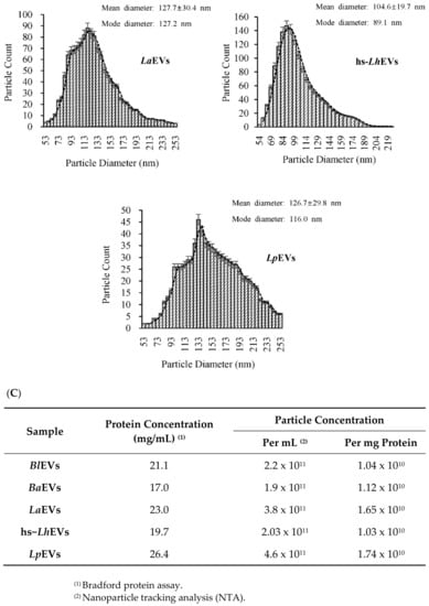 We isolated EVs from the supernatant of cultured PB including Bifidobacterium longum (Bl), B. animalis (Ba), Lactobacillus acidophilus (La), human-scalp-derived-Leuconostoc holzapfelii (hs-Lh), and Lactobacillus plantarum (Lp) using ultracentrifugation. The particle size and distribution of isolated PB-EVs were determined with nanoparticle tracking analysis (NTA) (Figure 2A). NTA analysis revealed that the UC-purified PB-EVs had mean diameters of 126.5 nm (BlEVs; mode diameter: 131.4 nm), 127.8 nm (BaEVs; mode diameter: 116.6 nm), 127.7 nm (LaEVs; mode diameter: 127.2 nm), 104.6 nm (hs-LhEVs; mode diameter: 89.1 nm), and 126.7 nm (LpEVs; mode diameter: 116.0 nm) (Figure 2B). The number of particles per mL of EVs and mg of protein concentration isolated from Bl, Ba, La, hs-Lh, and Lp were 2.2 × 1011 (per mg: 1.04 × 1010), 1.9 × 1011 (per mg: 1.12 × 1010), 3.8 × 1011 (per mg: 1.65 × 1010), 2.03 × 1011 (per mg: 1.03 × 1010), and 4.6 × 1011 (per mg: 1.74 × 1010), respectively (Figure 2C). For the morphological analyses of purified hs-LhEVs, EVs were measured using Cryo-TEM with negative staining, and the results showed that they had a spherical membrane structure and a lipid bilayer (Figure 2D). These results showed that multiple PB produce EVs of different sizes and that hs-LhEVs are remarkably smaller than other PB-EVs.
