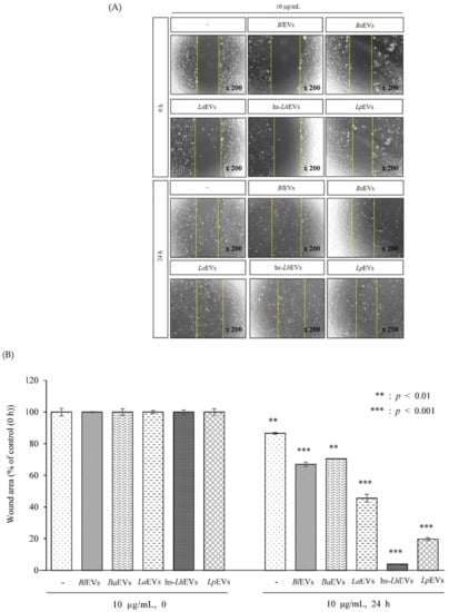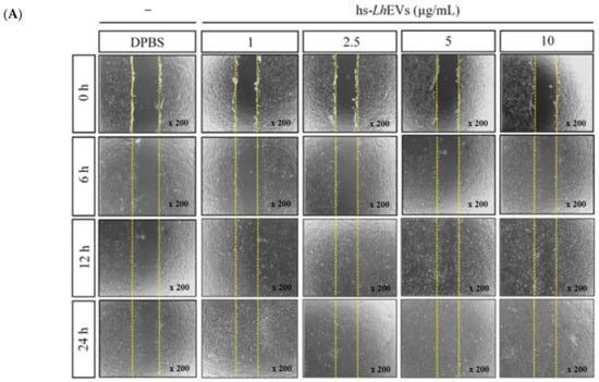 To understand whether EVs isolated from PB belonging to the Lactobacillus and Bifidobacterium genera could influence HFDP cell migration, a scratch wound healing assay was performed in the presence of 10 μg/mL of PB-EVs. We found that cell migration was generally increased by 24 h of treatment with all PB-EVs. However, cell migration following treatment with hs-LhEVs significantly increased compared to that with other PB-EVs (Figure 3A,B). As it was revealed that cell migration was enhanced by hs-LhEVs compared to other PB-EVs, we further examined the effects of hs-LhEVs on HFDP cells in dose- and time-dependent manners. With variations according to the treatment concentration and incubation time, the presence of hs-LhEVs was associated with the more rapid healing of the initial wound area than the PBS control. These results demonstrated that HFDP cell exposure to hs-LhEVs accelerated cell migration (Figure 4A,B). We also validated that the PB-EVs exerted a proliferative effect on HFDP cells. We treated the cells with 10 μg/mL of PB-EVs and measured proliferation with the CCK-8 assay after 24 h. HFDP cell proliferation increased from about 7 to 11% in all groups treated with PB-EVs except for hs-LhEVs, where cell proliferation significantly increased by 24% (Figure 3C). Further experiments on the effect of hs-LhEV treatment on cell proliferation revealed a dose-dependent effect. Taken together, these results suggest that PB-EV treatment induce cell migration and increase cell proliferation in HFDP cells, as well as that LhEVs have a greater effect than the other PB-EVs used in this study.