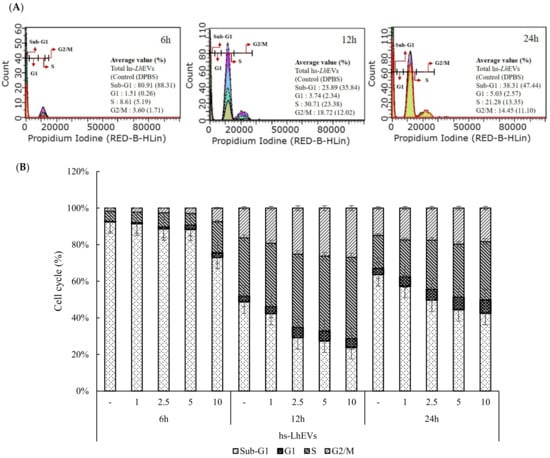 Analysis of the cell cycle status of hs-LhEVs discussed in (A–D). HFDP cells were seeded in a 6-well plate at 3 × 105 cells in 2 mL/well and cultured with complete medium for 24 h. Cells were starved in serum-free medium for 16 h and treated with 1, 2.5, 5, and 10 μg/mL of hs-LhEVs for 6, 12, and 24 h in same conditioned medium. (A) Cell cycle histogram with propidium iodide (P.I) fluorescence profiles treated with hs-LhEVs in dose- and time-dependent manners. (B–D) Analysis data of cell cycle shown in (A). Data are reported as mean ± SD of three independent experiments.