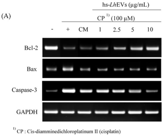 Based on the previous results indicating effects on the cell cycle (Figure 5), we examined whether hs-LhEVs could regulate apoptosis-associated mRNA expression in cisplatin-induced HFDP cells in comparison with the supernatant of hs-LhCM. Reverse transcription PCR (RT-PCR) studies following hs-LhEV treatment showed the expression of anti-apoptotic Bcl-2 and pro-apoptotic Bax, as well as the activation of caspase-3 mRNA, in a dose-dependent manner. These results indicate that hs-LhEV treatment induced Bcl-2 mRNA and Bax expression and reduced caspase-3 activity compared to the control (Figure 6). In the case of hs-LhCM treated at the same concentrations (maximum concentration: 10 μg/mL) as hs-LhEVs, the anti-apoptotic effects in cisplatin-induced HFDP cells were minor compared to hs-LhEVs. These results support the idea that hs-LhEVs remarkably inhibit the effects of cisplatin on the apoptosis-regulatory genes Bcl-2 and Bax in a dose-dependent manner. In addition, hs-LhEVs inhibited caspase-3 mRNA expression and decreased the ratio of Bcl-2 to Bax (Figure 6). Taken together, these results suggest that hs-LhEVs suppress apoptosis-related factors more than CM of hs-Lh and correspond with the cell cycle results in cisplatin-induced HFDP cells (Figure 5).