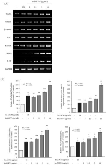 Next, to validate whether hs-LhEVs affect the hair-inductive activity of HFDP cells, we measured the expression levels of genes associated with Wnt/β-catenin signaling transduction. In detail, we investigated changes in the patterns of hair-related factors in the absence or presence of hs-LhEVs. The mRNA expression of Wnt5A, Wnt10B, and β-catenin in hs-LhEV-treated HFDP cells was significantly increased compared to the PBS control at 24 h (Figure 7). In addition, the expression levels of VSC, Lef1, BAMBI, and BMP-2 were increased in a dose-dependent manner following hs-LhEV exposure (Figure 7). Our results especially show that treatment with 10 μg/mL of hs-LhEVs remarkably accelerated the expression of Wnt-signaling-related genes. Taken together, these results suggest that hs-LhEVs could promote the hair-inductive activity of HFDP cells more than the PBS or CM controls through the Wnt/β-catenin signaling pathway.