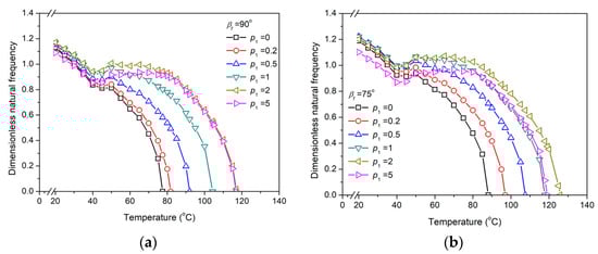 Figure 4a depicts the dimensionless natural frequency of composite laminates under different  when  = 90°. As the temperature rises, the natural frequencies corresponding to different  change trends from basically similar to gradually separated. In the low-temperature range of 15 °C to 40 °C, the natural frequency decreases rapidly as the temperature increases. The decrease in the natural frequency is due to the increase in thermal stress caused by the large modulus of graphite, which plays a leading role in the stiffness of composite laminates. Simultaneously, the recovery stress generated by the SMA pre-strain induced at a temperature below 40 °C is generally less than 100 MPa, as shown in Figure 2, which has a weak influence on the stiffness of composite laminates []. Although the gradient distribution of the SMA wires orientation leads to differences in the recovery force of each layer, the overall recovery force of the composite laminates along the X-axis direction is still less, so the effect of pre-strain on the stiffness of the composite laminates can be ignored. As the temperature ranges from 40 °C to 75 °C, recovery stress induced by SMA pre-strain is higher than the thermal stress that is produced by graphite and epoxy. The recovery force in the composite laminates plays a dominant role in increasing the stiffness, thus increasing the natural frequency with increasing temperature. With the continuous increase in temperature, the recovery stress basically stabilizes, and the thermal stress plays a leading role again, resulting in the natural frequency of the composite laminates again being reduced until buckling occurs. In addition, Figure 4a shows that the gradient orientation of the SMA wires has a significant effect on the natural frequency of the  mainly after the temperature is higher than 40 °C. The natural frequency increases with the increase in  after the temperature rises to 65 °C, and the difference in the increase in the natural frequency is no longer obvious until  is greater than 2. It is worth noting that the highest natural frequency corresponding to  and the critical buckling temperature  is positively correlated with .