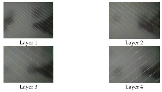 To verify the theoretical formula accuracy of this study, two composite laminate samples embedded with SMA wires were fabricated in this research. Composite laminates samples were fabricated in which SMA wires were embedded in two gradient distributions: symmetric orthogonal gradient distribution and anti-symmetric oblique gradient distribution. The sample matrices consisted of graphite and epoxy composite layers. SMA wires were assembled by hand lay-up between the layers. Subsequently, the contact interface was filled by a solution deployed by 325 mesh graphite powders and YDF-170 epoxy resin supplemented with 2-ethyl-4-methylimidazole curing agent at 6% mass ratio. The curing process of hardening the contact interface filling between layers required approximately 15 min with external heating at 60 °C. The length and width of composite laminates were 400 mm and 300 mm, respectively. Six layers were laid, each with a thickness of 2 mm. Table 2 and Table 3 show the laying parameters of symmetric orthogonal and antisymmetric oblique laying of SMA wires in composite laminates, respectively. The laying pattern of the SMA wires laying diagonally in each layer is shown in Figure 11.
