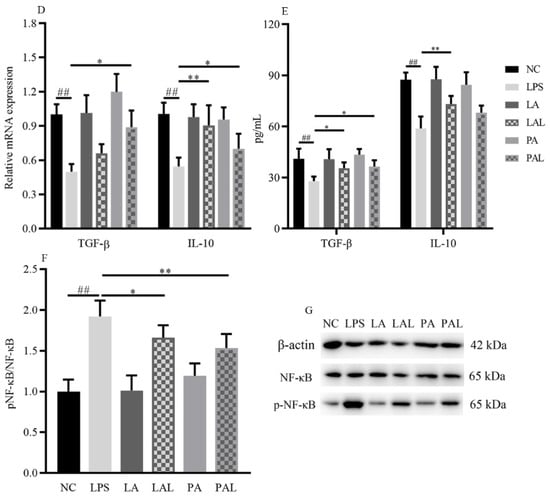 A. muciniphila inhibits LPS-induced inflammatory responses. (A) The experiment design of Caco-2 cells pretreatment with A. muciniphila. (B,C) The effect of A. muciniphila on expressions of TNF-α, IL-1α, IL-1β, IL-6, IL-8, (D,E) TGF-β, and IL-10 in Caco-2 cells. (F,G) A. muciniphila inhibits the activation of the NF-κB signaling pathway. ** p < 0.01, * p < 0.05, compared with LPS, ## p < 0.01, # p < 0.05, compared with NC group, && p < 0.01, LAL compared with PAL. Data are expressed as mean ± S.D. (n = 6). LPS, lipopolysaccharide. NF-κB, Nuclear Factor-Kappa B.