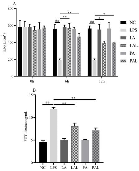 A. muciniphila improves the barrier function dysfunction induced by LPS. (A) The TER value and (B) FITC-dextran value of Caco-2 cell monolayers. ** p < 0.01, * p < 0.05, compared with LPS group. ## p < 0.01, compared with NC group. Data are expressed as mean ± S.D. (n = 6). TER, transepithelial electrical resistance. FITC-dextran, fluorescein isothiocyanate-dextran. NC, control group. LPS, lipopolysaccharide-damaged group. LA, live A. muciniphila. PA, pasteurized A. muciniphila. LAL, live A. muciniphila + LPS. PAL, pasteurized A. muciniphila + LPS.