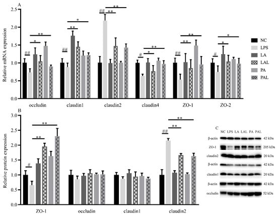 A. muciniphila affects the expression of tight junction proteins. (A) The level of relative mRNA expression, (B,C) and protein expression of tight junction proteins. ** p < 0.01, * p < 0.05, compared with LPS group. ## p < 0.01, # p < 0.05, compared with NC group. Data are expressed as mean ± S.D. (n = 6). NC, control group. LPS, lipopolysaccharide-damaged group. LA, live A. muciniphila. PA, pasteurized A. muciniphila. LAL, live A. muciniphila + LPS. PAL, pasteurized A. muciniphila + LPS.