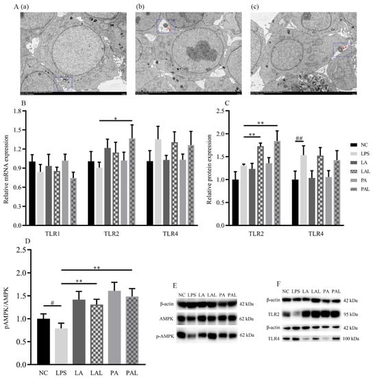 The activation of AMPK was mediated by A. muciniphila through TLR2 in LPS Caco-2 cells. (A(a–c)) The TEM images of A. muciniphila attaching to Caco-2 cells. The red arrows indicate A. muciniphila. The blue circles indicate cross-section between cells and A. muciniphila. Scale bars, 5 μm. (B,C,F) The expression of TLR2, TLR4, (D,E) and activation of AMPK in Caco-2 cells treated with A. muciniphila. (G–I) The activation of AMPK in Caco-2 cells treated with A. muciniphila, AICAR, or dorsomorphin. (J–L) The activation of AMPK in Caco-2 cells treated with A. muciniphila, C29, AICAR, or dorsomorphin. ** p < 0.01, * p < 0.05, compared with LPS group; ## p < 0.01, # p < 0.05, compared with NC group. Data are expressed as mean ± S.D. (n = 6). NC, control group. LPS, lipopolysaccharide-damaged group. LA, live A. muciniphila. PA, pasteurized A. muciniphila. LAL, live A. muciniphila + LPS. PAL, pasteurized A. muciniphila + LPS. AMPK, AMP-activated protein kinase. TLR, Toll-like receptor. AICAR, 5-Aminoimidazole-4-carboxamide ribonucleotide. C29, C16H15NO4.
