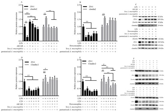 A. muciniphila mediated the expression of ZO-1 and claudin2 through activation of the AMPK signaling pathway dependent on TLR2 in Caco-2 cells. (A–C) The ZO-1 and claudin2 protein expressions were treated with AICAR or dorsomorphin in Caco-2 cells. (D–F) The level of ZO-1 and claudin2 treated with C29, AICAR, or dorsomorphin in Caco-2 cells induced by pretreatment with A. muciniphila. ** p < 0.01, compared with LPS group; ## p < 0.01, # p < 0.05, compared with NC group. Data are expressed as mean ± S.D. (n = 6). LPS, lipopolysaccharide. AICAR, 5-Aminoimidazole-4-carboxamide ribonucleotide. C29, C16H15NO4. ZO, zonula occludens.