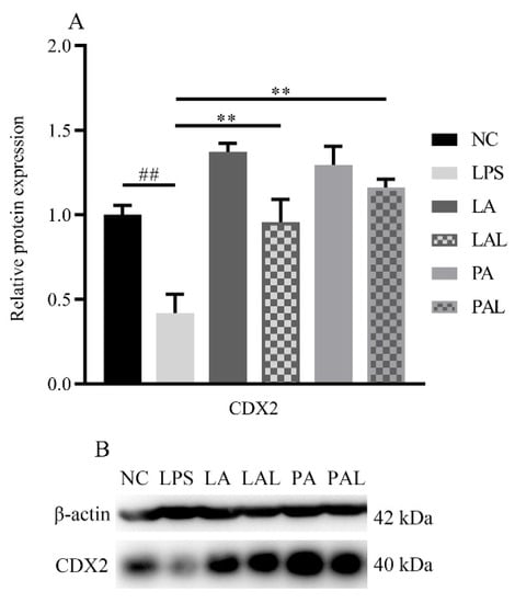 A. muciniphila mediated the expression of CDX2. (A,B) The protein expression of CDX2 in Caco-2 cells. ** p < 0.01, compared with LPS group. ## p < 0.01, compared with NC group. Data are expressed as mean ± S.D. (n = 6). NC, control group. LPS, lipopolysaccharide-damaged group. LA, live A. muciniphila. PA, pasteurized A. muciniphila. LAL, live A. muciniphila + LPS. PAL, pasteurized A. muciniphila + LPS. CDX2, Caudal type homeobox 2.