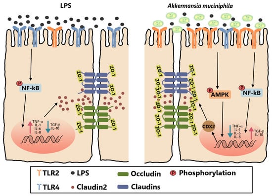 Research on the mechanism of A. muciniphila’s beneficial effects is deficient and warrants further study. AMP-activated protein kinase (AMPK) can act as an intracellular energy sensor for regulating energy homeostasis and metabolic stress and is activated by metformin and polyphenols [,,]. Additionally, AMPK was found to promote the assembly of zonula occludens-1 (ZO-1) []. Therefore, we hypothesize A. muciniphila pretreatment may regulate tight junctions through the AMPK pathway in LPS-treated Caco-2 cells. We investigated the improving effect of live and pasteurized A. muciniphila on LPS-impaired barrier function in Caco-2 cell monolayers, respectively. We found that A. muciniphila may activate the AMPK and inhibit the NF-κB signaling pathway through modulating TLR2. This study provides a scientific basis for the understanding and application of A. muciniphila as probiotics.