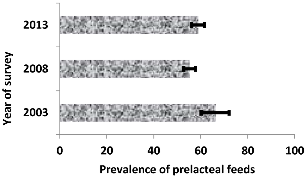 Our result indicated that the prevalence of prelacteal feeding fluctuated (i.e., between 66.4% in 2003, 55.3% in 2008, and 59.0% in 2013) over the study period (Figure 1). These results could be translated to a significant decrease of about 11% in 2008 compared to 2003, and an increase of about 4% in 2013 compared with 2008 but this increase did not differ statistically.