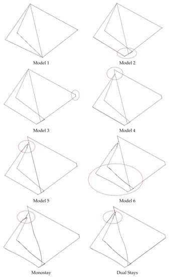 During the changes described in Section 2.2, the spaceframe was tested to determine which loads affected each part of the frame. These loads were used as a guide when adding shape to the spaceframe to acquire optimized mechanical strength and controllable deformation phenomena. The first six models were not actually viable solutions as their shape cannot accommodate all the necessary equipment needed in a bicycle. Even though Model_6 looked like a viable solution, the short chain stays do not allow the rear wheel to fit on the frame. Only the last four models, mono-stay, dual-stays, complex, and optimized, were the real possible solutions; however, we extended the analysis to the first six models to see how the evolution of our design affected the stresses and displacements that occur on the spaceframe models.