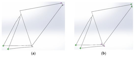 Our initial goal was to depict the frame dimensions that came from statistical bike fitting measurements and rider reviews of previous designs so that we could have a starting point for the first frame size design. The other sizes would come up later, after the completion of the prototype, and create a database for future reference and further evolution. This initial design would be changed to meet manufacturing needs and standards compliance. A basic sketch of the frame’s tubes and their names are shown in Figure 3 []. The design sequence is shown in Figure 4, and the design change steps are described below.
