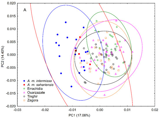 Several studies have been conducted to characterise and differentiate honey bee subspecies around the world using various approaches, including classic and geometric morphometrics as well as genetic tools [7,12,13,18,19,20]. Using classical morphometry analysis, Cornuet et al. [14] were able to prove the presence of three distinct honey bee subpopulations in Morocco. However, mtDNA testing did not clearly differentiate these three groups [4]. Likewise, a geometric morphometric analysis was conducted to differentiate A. m. sahariensis from its immediate neighbour, A. m. intermissa from Algeria and from the South African subspecies A. m. capensis [8].