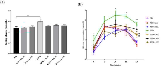 Effect of geraniin and GEE on glucose homeostasis among ND and HFD-fed rats. (a) Fasting blood glucose (FBG), (b) oral glucose tolerance test (OGTT), (c) OGTT AUC, (d) fasting insulin (FI), (e) homeostatic model assessment of insulin resistance (HOMA-IR). Sample size, n = 6. * p < 0.05, *** p < 0.0001 HFD compared to ND. # p < 0.05, ## p < 0.005, ### p < 0.0005 HFD compared to the treatment groups fed an HFD.